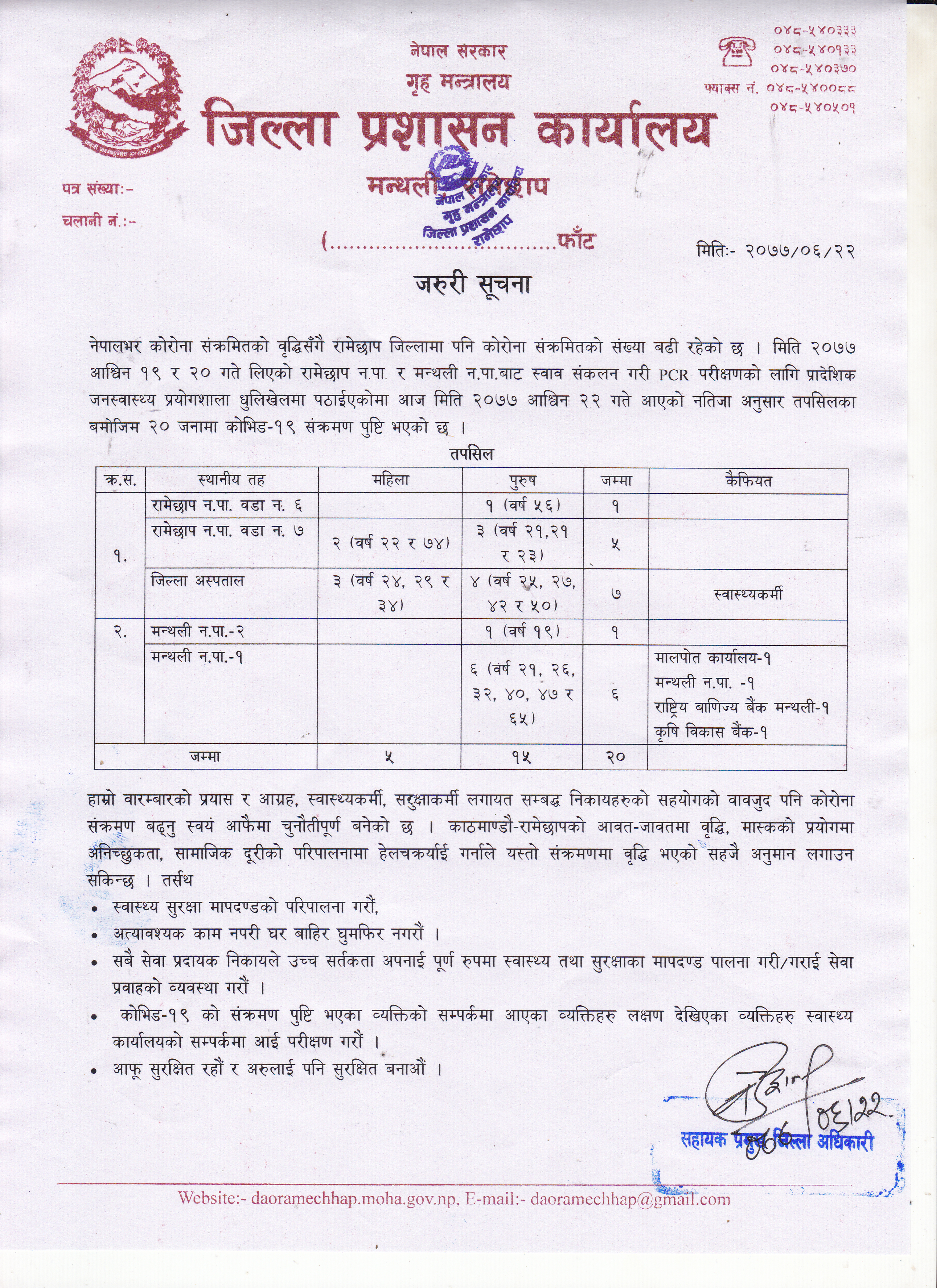जिल्ला प्रशासन कार्यालय रामेछापले कोरोनाको संक्रिमित जिल्लाभित्र बढनुमा रामेछाप–काठमाडौं आवत जावतमा बृद्धि, मास्कको प्रयोगमा अनिच्छुकता, सामाजिक दुरीको परिपालनामा हेलचेक्रयाइँ गर्नाले संक्रमणमा बृद्धि भएको बताएको छ ।