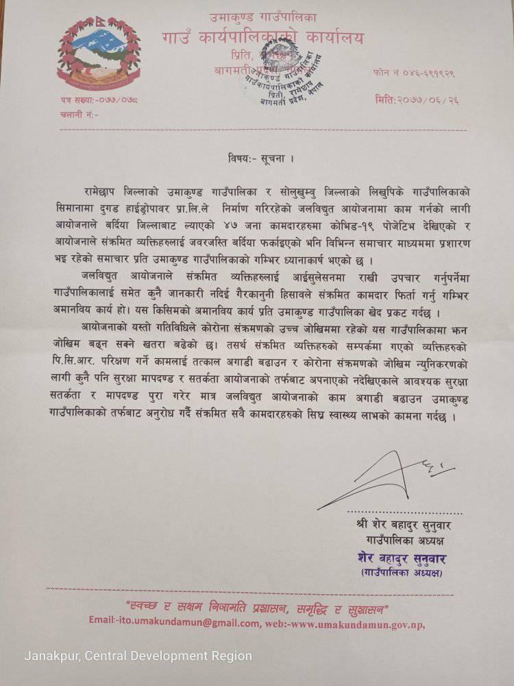 विज्ञप्तीमा भनिएको छ,संक्रमित कामदारलाई आइसोलेसनमा राखी उपचार गर्नुपर्नेमा गाउँपालिकालाई समेत जानकारी नदिई गैरकानुनी रुपमा घर फर्काउनु गम्भिर अमानवीय कार्य हो । आयोजनाको कारण उमाकुण्ड गाउँपालिकामा कोरोना संक्रमणको उच्च जोखिम बढेको बताउदै अध्यक्ष सुनुवारले संक्रमितको सम्पर्कमा आएका मानिसको तत्काल पीसीआर परीक्षण गरी संक्रमण फैलनबाट रोक्न आग्रह गर्नुभएको छ । गाउँपालिकाले सुरक्षा मापदण्डको प्रयोग गरेर मात्र आयोजना निर्माणको काम अघि बढाउन आयोजनालाई आग्रह गरेको छ ।