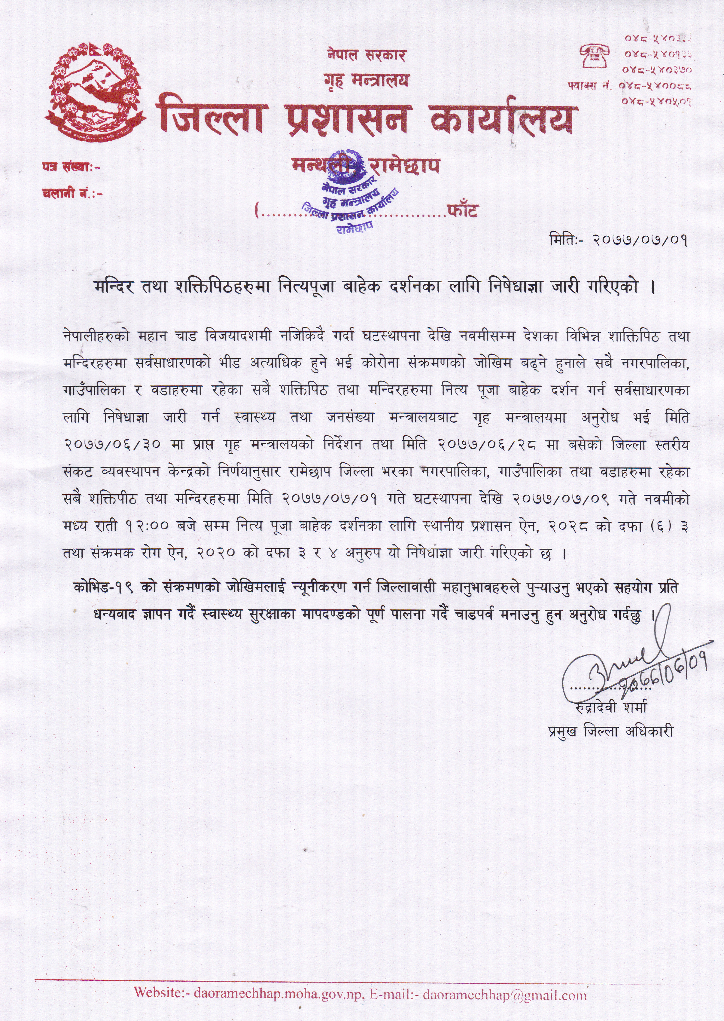 रामेछापका प्रमुख जिल्ला अधिकारी रुद्रादेवी शर्माले जिल्ला स्तरीय संकट व्यवस्थापन केन्द्रको निर्णयअनुसार रामेछाप जिल्लाभरका नगरपालिका, गाउँपालिका तथा वडाहरुमा रहेको सबै शक्तिपिठ तथा मन्द्यिहरुमा कआगामी कातिृक ९ गतेसम्म निषेधाज्ञा जारी गरेको बताउनुभयो ।