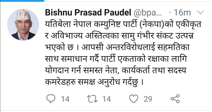 पौडेलले लेख्नुभएको छ,‘‘यतिबेला नेपाल कम्युनिस्ट पार्टीको एकीकृत र अविभाज्य अस्तित्वका सामु गम्भिर संकट उत्पन्न भएको छ । आपसी अन्तरविरोधलाई सहमतिका साथ समाधान गर्दै पार्टी एकताको रक्षाका लागि योगदान गर्न समस्त नेता, कार्यकर्ता तथा सदस्य कमरेडहरुसमक्ष अनुरोध गर्दछु ।’