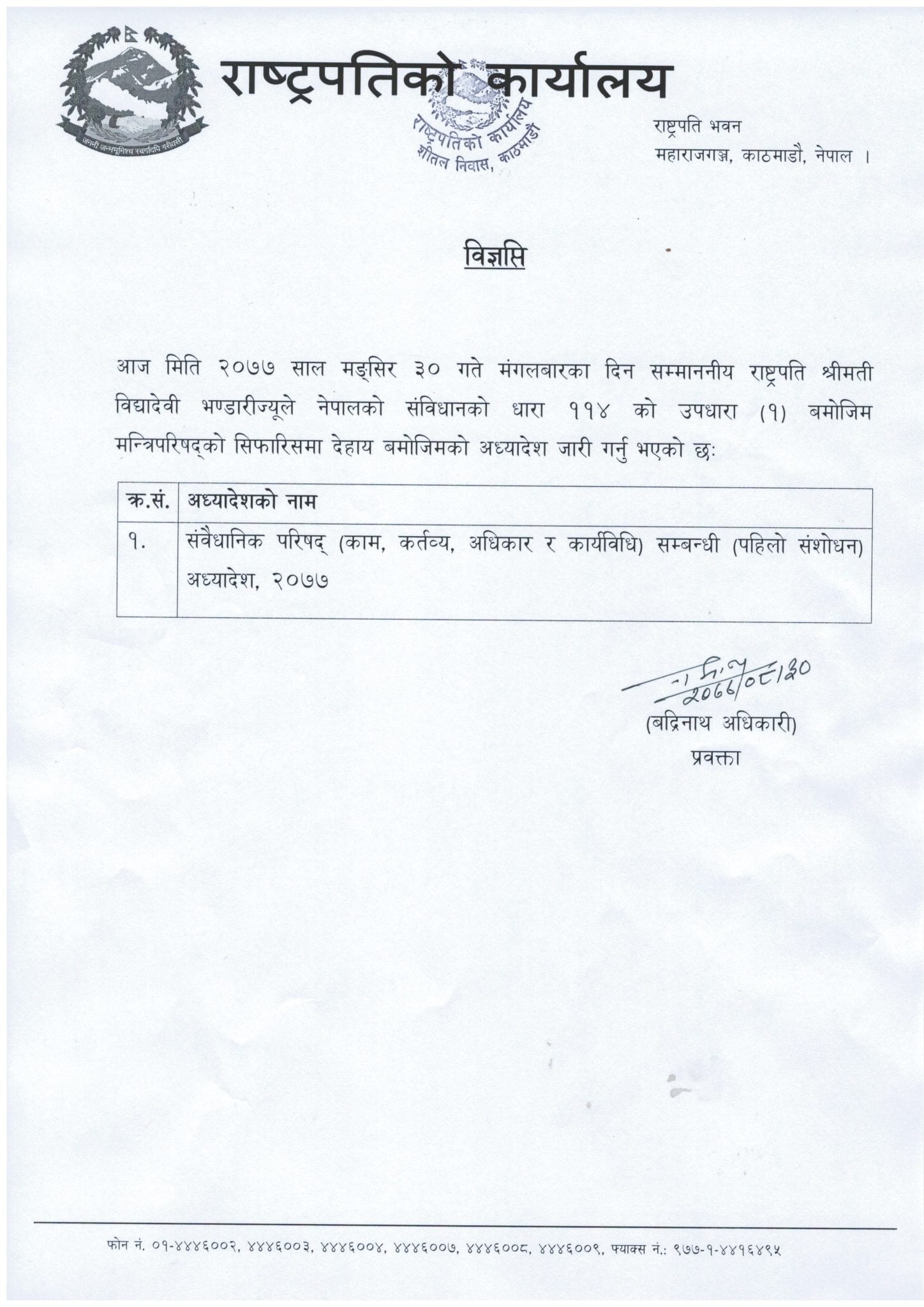 राष्ट्रपतिद्धारा संवैधानिक परिषद् सम्बन्धी अध्यादेश जारी