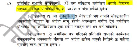 नेपालको संविधानमा संसद विघटनसम्बन्धी प्रावधान स्पष्ट छैन। संविधानको धारा ८५ को १ मा यस संविधान बमोजिम अगावै विघटन भएकामा बाहेक प्रतिनिधि सभाको कार्यकाल ५ वर्षको हुनेछ भन्ने उल्लेख छ।
