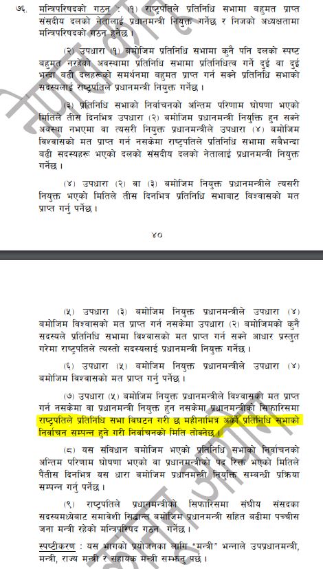 संविधानको धारा ७६ को उपधारा ७ को ५ मा प्रधानमन्त्रीले विश्वासको मत प्राप्त गर्न नसकेमा वा प्रधानमन्त्री नियुक्त हुन नसकेमा प्रधानमन्त्रीको सिफारिसमा राष्ट्रपतिले प्रतिनिधि सभा विघटन गरि ६ महिनाभित्र अर्को प्रतिनिधि सभाको निर्वाचन सम्पन्न हुने गरी निर्वाचनको मिति तोक्ने उल्लेख छ।