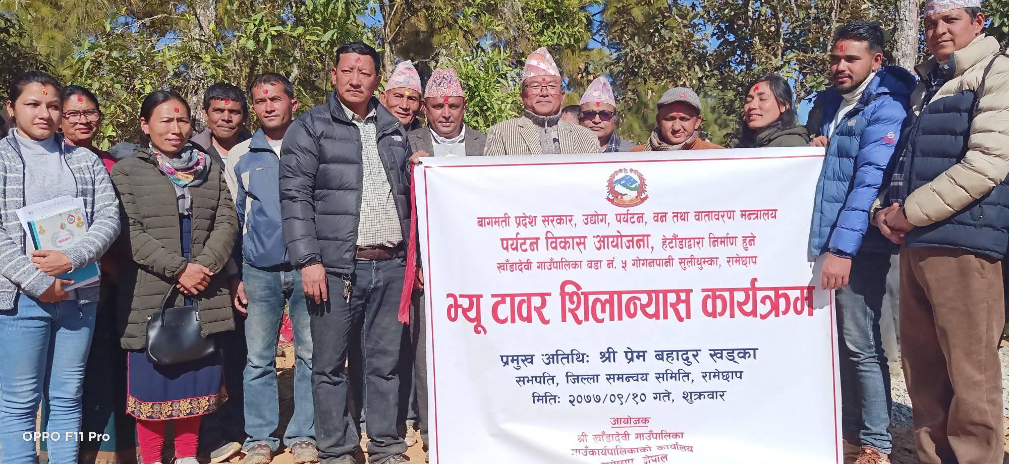 भ्युटावरको जिल्ला समन्वय समितिका प्रमुख प्रेम बहादुर खड्का र खँडादेवी गाँउपालिका अध्यक्ष प्रेम बहादुर तमाङले संयुक्त रुपमा शिलान्यास गरेका छन् । गाउँपालिकाका अध्यक्ष तामाङले भ्युटावर निर्माण भएपछि रामेछाप,दोलखा,सिन्धुली र काभ्रे जिल्लाका अधिकांश क्षेत्रकहरुको दृश्यावलोक गर्न सकिने बताए ।