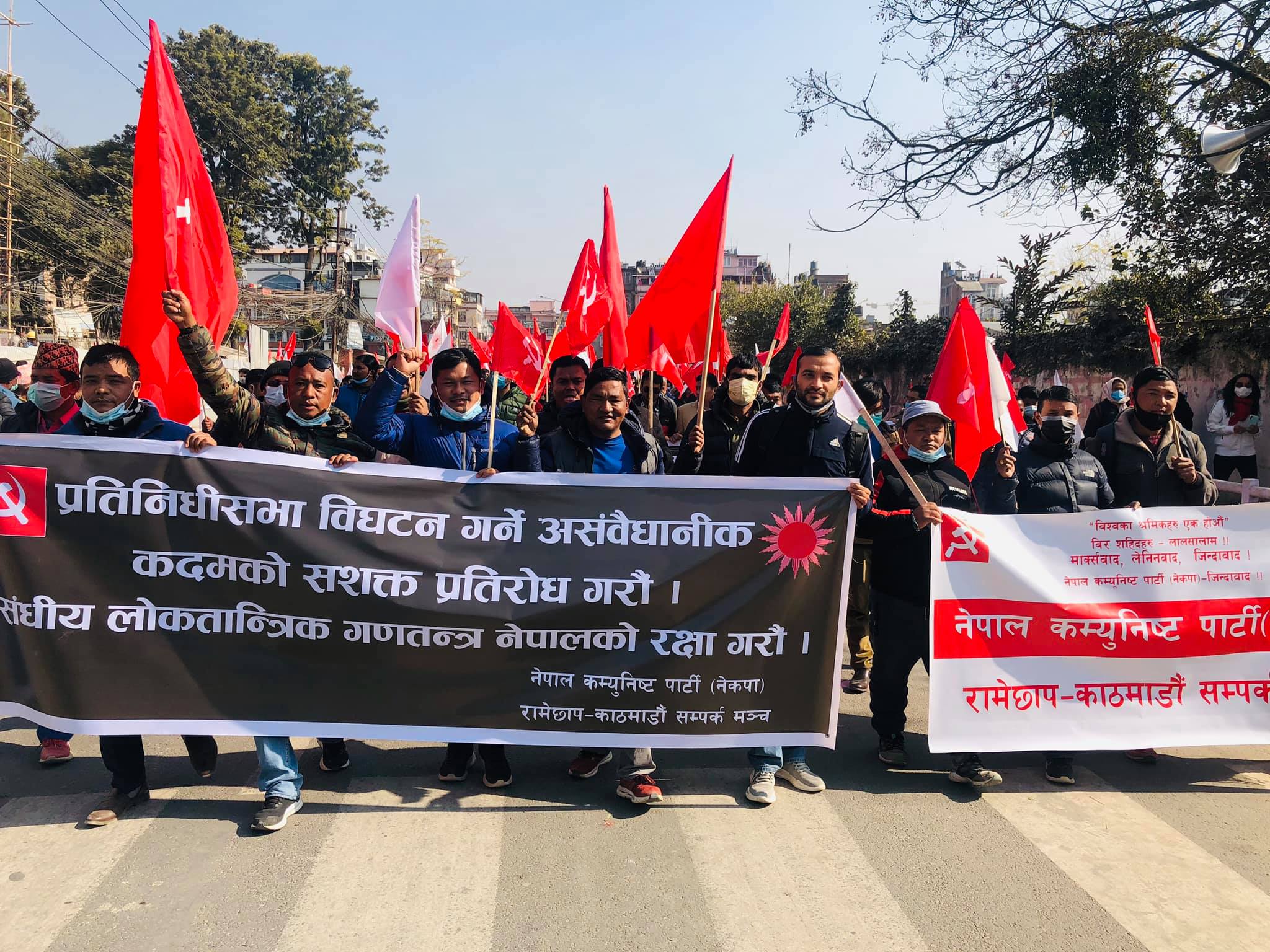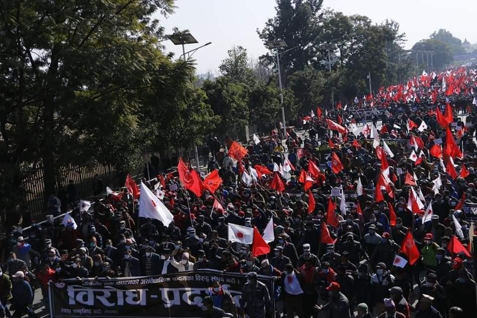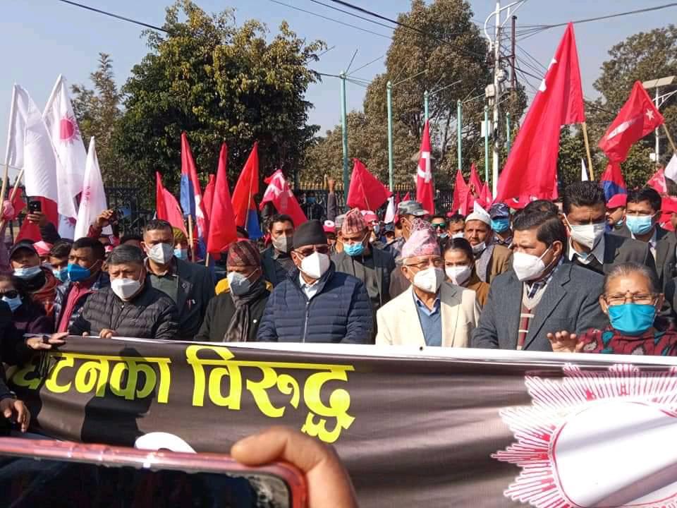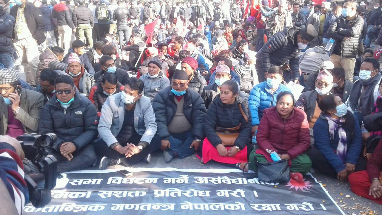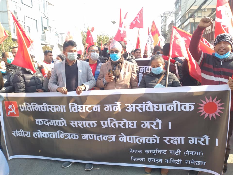 संसद विघटनको विरुद्ध नेकपा प्रचण्ड–नेपाल समुहले राजधानी काठमाडौं उपत्यका सहित देशभर विरोध प्रदर्शन गरेको छ । काठमाडौं आज आयोजित विरोध सभालाई अध्यक्ष पुष्पकमल दाहाल ‘प्रचण्ड’, अध्यक्ष माधव कुमार नेपाल लगायतका नेताहरुले सम्बोेधन गरेका थिए । सभामा सहभागी हुन उपत्यकाका विभिन्न ठाउँबाट निस्केको जुलुस भृकुटीमण्डपतिर पुगेको थियो ।