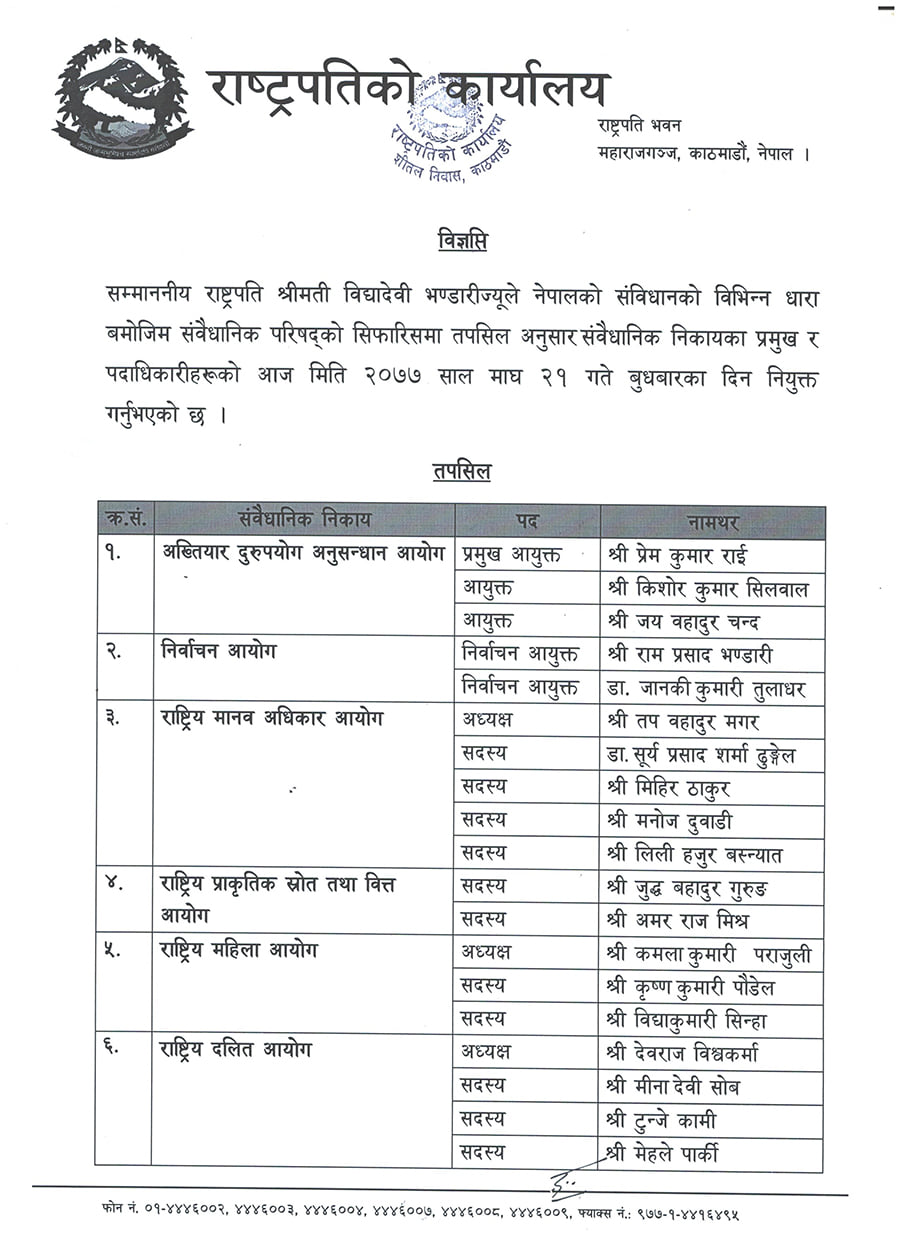 संवैधानिक परिषद्ले सिफारिस गरेका संवैधानिक निकायका पदाधिकारीहरु नियुक्त भएका छन् ।संवैधानिक परिषदको सिफारिसमा राष्ट्रपति विद्यादेवी भण्डारीले अख्तियार दुरुपयोग अनुसन्धान आयोग, निर्वाचन आयोगलगायतका लगायतका संवैधानिक निकायमा ५ जना प्रमुख आयुक्त,अध्यक्ष तथा २७ जना आयुक्त सदस्य नियुक्त गरेकी हुन् ।