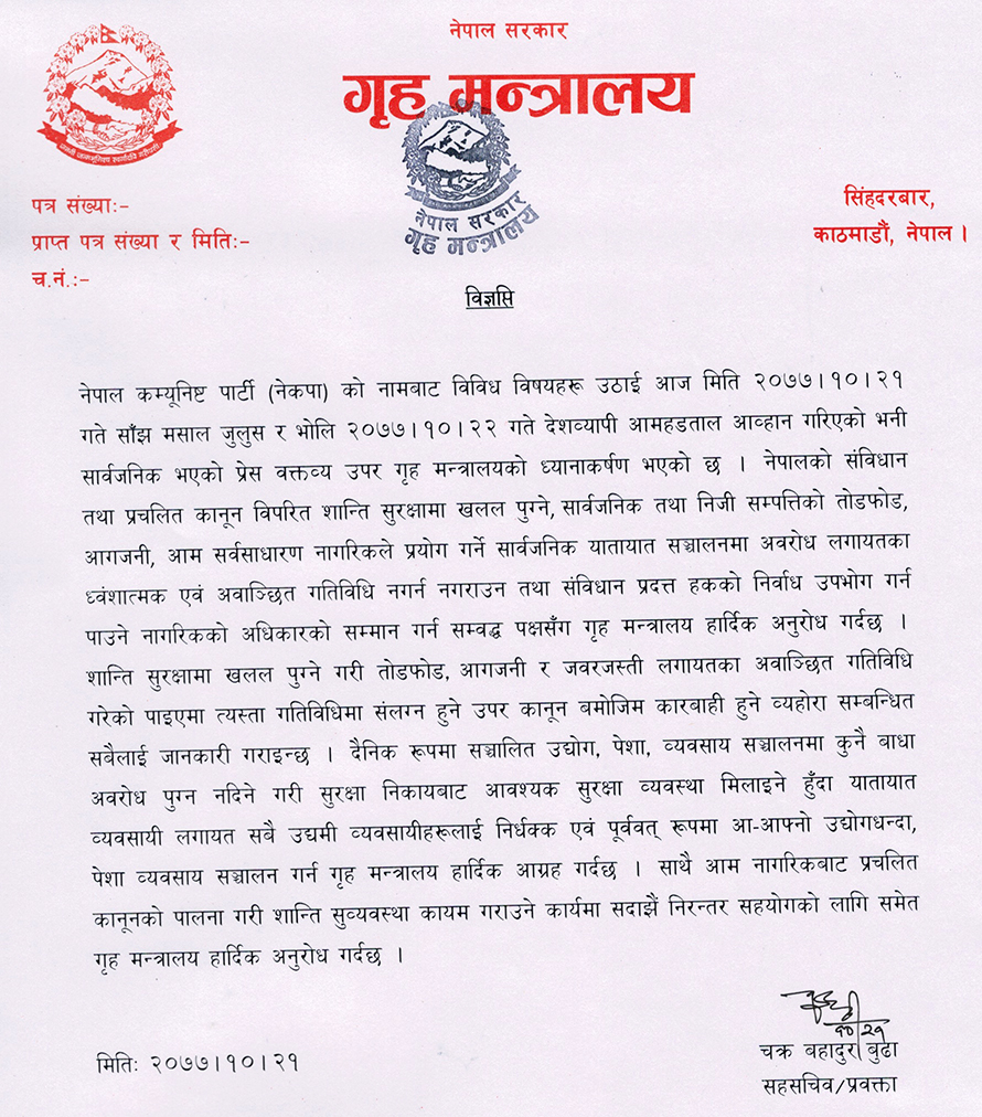 गृह मन्त्रालयले भने बुधबार साँझ विज्ञप्ति जारी गर्दै संविधान र प्रचलित कानून विपरीत शान्ति सुरक्षामा खलल पुग्ने, सार्वजनिक तथा निजी सम्पत्तिको तोडफोड, सार्वजनिक यातायात सञ्चालनमा अवरोध नगर्न आग्रह गरेको छ । शान्ति सुरक्षामा खलल पुग्ने गरी तोडफोड, आगजनी र जबरजस्ती लगायतका गतिविधि गरे कानून बमोजिम कारबाही गर्ने मन्त्रालयले चेतावनी दिएको छ ।