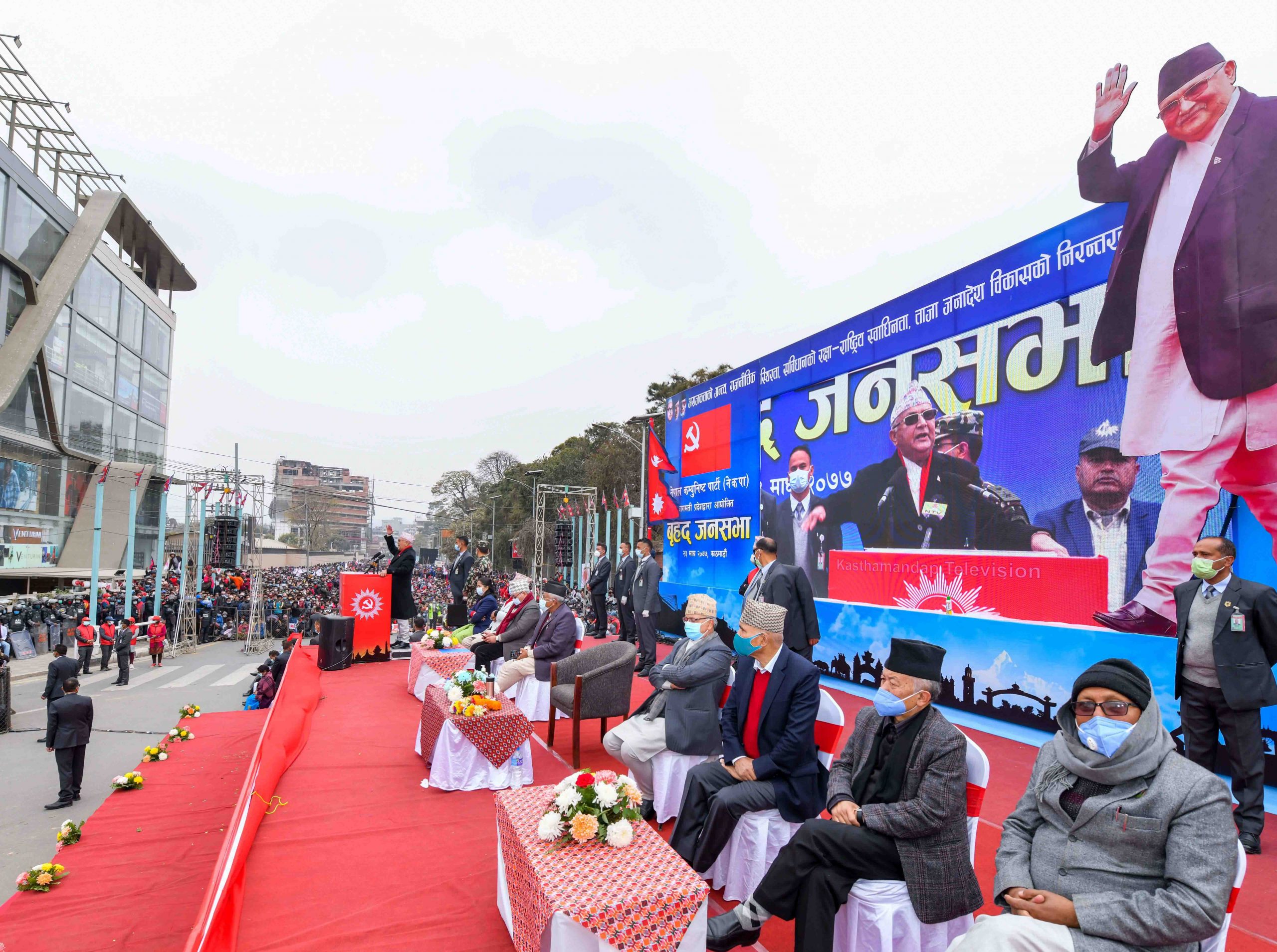 नेकपा ओली समूहको आमसभा सम्पन्न भएको छ । काठमाडौँको दरबारमार्गस्थित नारायणहिटी दरबार संग्रहालय अगाडि भएको कार्यक्रममा बाजागाजासहितको झाँकी निकालिएको थियो । जनसभा हुनु भन्दा अघि काठमाडौँको बागबजार, प्रदर्शनीमार्ग, महेन्द्र शालिक, घण्टाघर, सुन्धारा, त्रिपुरेस्वर, गौशाला, मातीघर मण्डला, पुतलीसडक, लैनचौर, सोह्रखुट्टे, टेकू, वसन्तपुर, ज्ञानेश्वर तथा पुरानो बानेस्वरलगायतका स्थानबाट र्याली निकालिएको थियो । विभिन्न स्थानबाट निस्किएको उक्त र्याली नारायणहिटी दरबार संग्रहालयबाहिर आयोजना गरिएको सभामा गएर टुंगिएको थियो ।