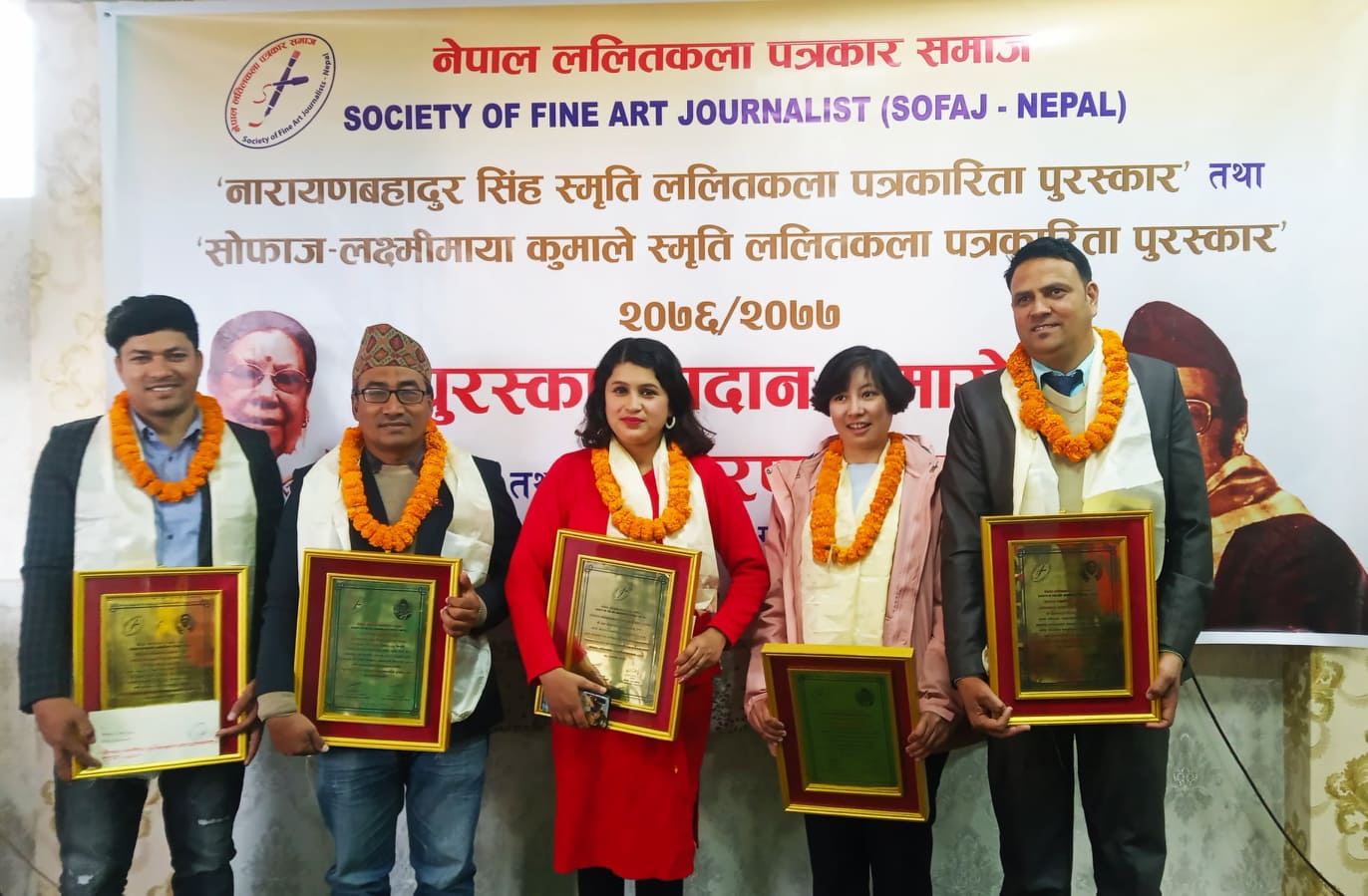 नेपाल ललितकला प्रज्ञाप्रतिष्ठानका कुलपति कान्छाकुमार कर्माचार्य, क्रोधकला शिरोमणी कालु कुमाले र सोफाजका अध्यक्ष केशवराज खनालले संयुक्त रुपमा पुरस्कार प्रदान गर्नुभएको हो ।कार्यक्रममा कुलपति केके कर्माचार्यले पुरस्कृतहरुलाई बधाई दिनुहुँदै ललितकलाको विकास र विस्तारमा मिडियाको भूमिका महत्वपूर्ण हुने बताउनुभयो ।