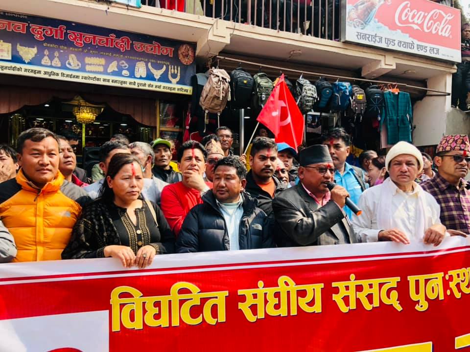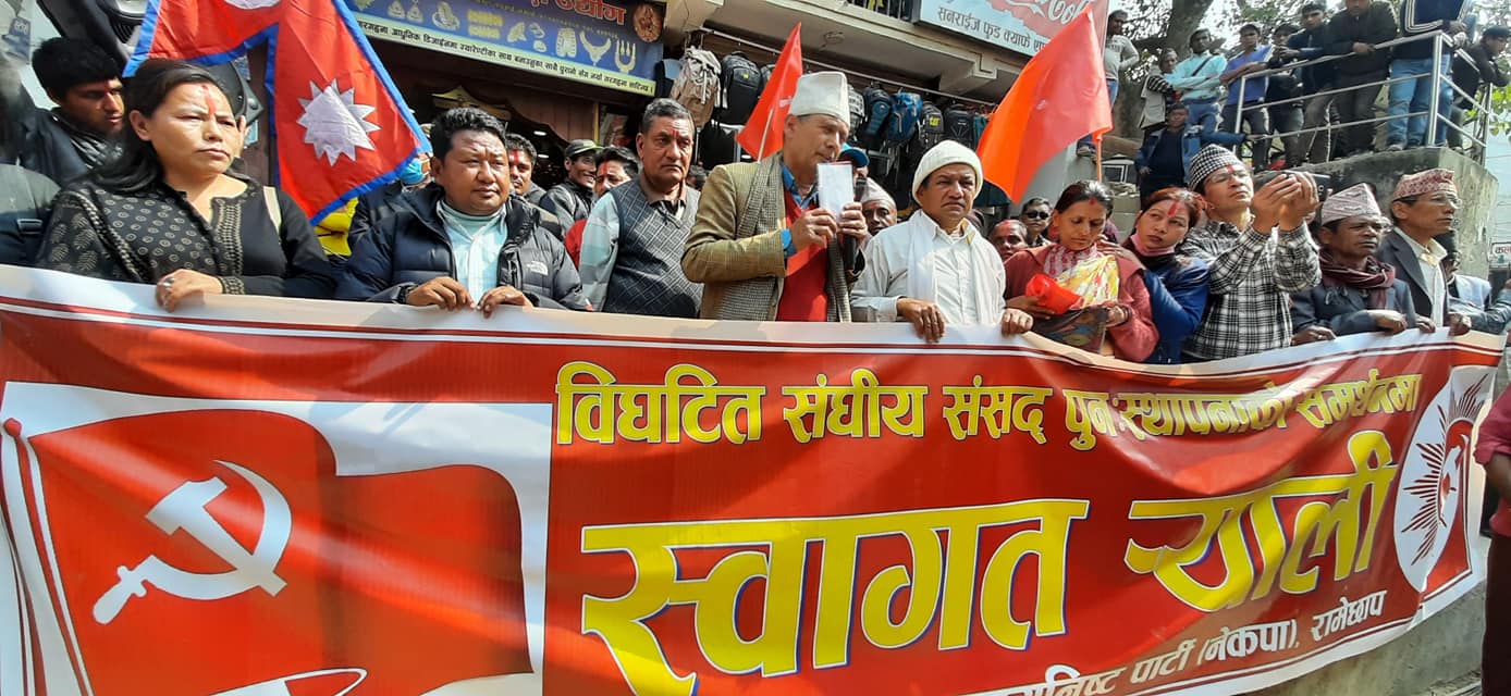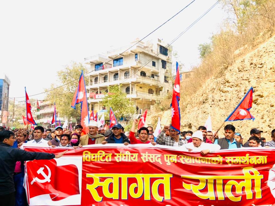 नेकपा प्रचण्ड–नेपाल समुहले संसद पुर्नस्थापनको खुसीयालीमा सदरमुकाम मन्थलीमा विजयी जुलुस निकालेको छ । सर्वोच्च अदालतले संसद विघटन गर्ने सरकारको निर्णयलाई बदर गर्दै संसद पुर्नस्थापना गरेसँगै नेकपाले आज मन्थलीमा विजयी जुलुस निकालेको हो ।