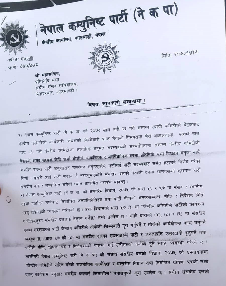 प्रधानमन्त्री ओलीलाई दलको नेताबाट हटाएको पत्र संसद सचिवालय पुग्यो (पत्रसहित)