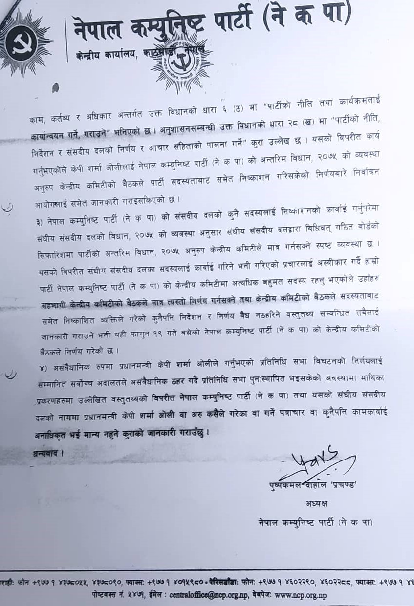 नेकपा प्रचण्ड–नेपाल समुहले प्रधानमन्त्री केपी शर्मा ओलीलाई दलको नेताबाट हटाएको जानकारी सहितको पत्र संसद सचिवाललाई बुझाएको छ । प्रचण्ड नेपाल समुहले प्रधानन्त्री ओली सहित उपनेता सुवास नेम्वाङ, सचेतक शान्ता चौधरी लगायतलाई हटाएकोबारे संघीय संसद् सचिवालयलाई जानकारी गराएको हो ।