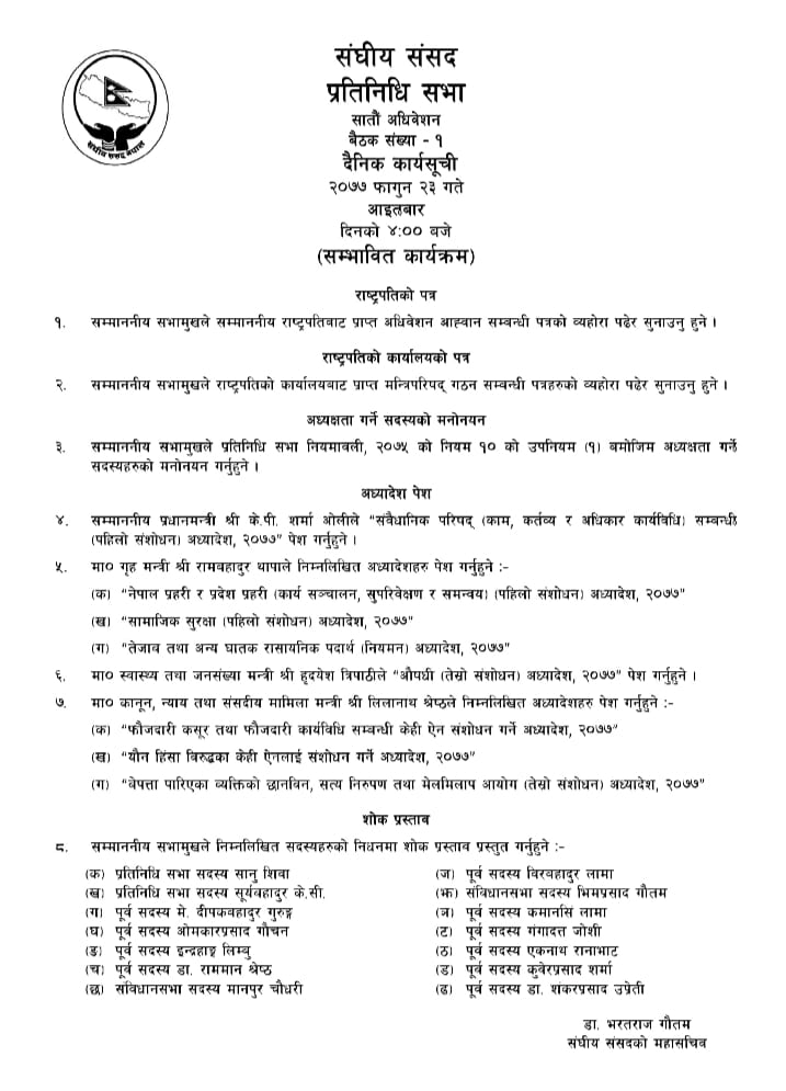 पुनर्स्थापित प्रतिनिधिसभाको पहिलो बैठक आज बस्दै, यस्ताे छ कार्यसूची