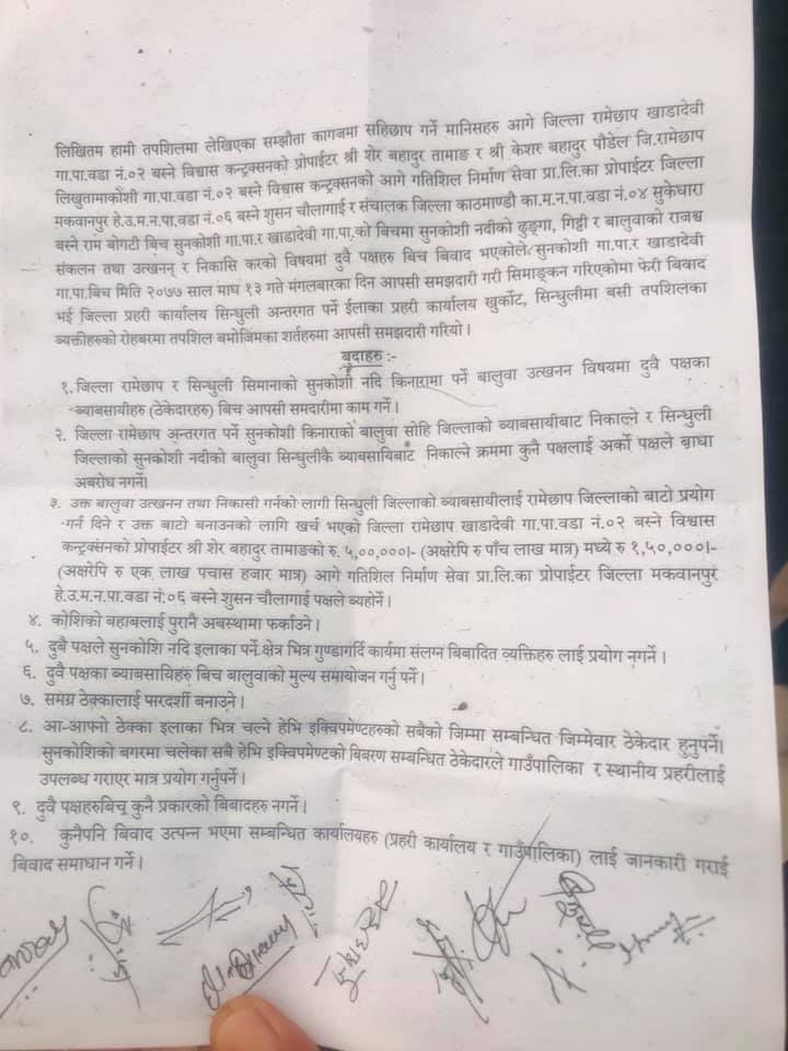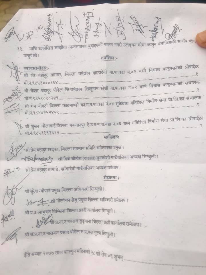 समझदारी पत्रमा विश्वास कन्ट्रक्सनका प्रोपाइटर शेर बहादुर तामाङ, सोही कन्ट्रक्सनका सञ्चालक केशर बहादुर पौडेल, गतिशिल निर्माण सेवाका सञ्चालक राम बोगटी र सोही कम्पनीका प्रोपाइटर सुशन चौलागाईबीच समझदारी बनेको छ ।