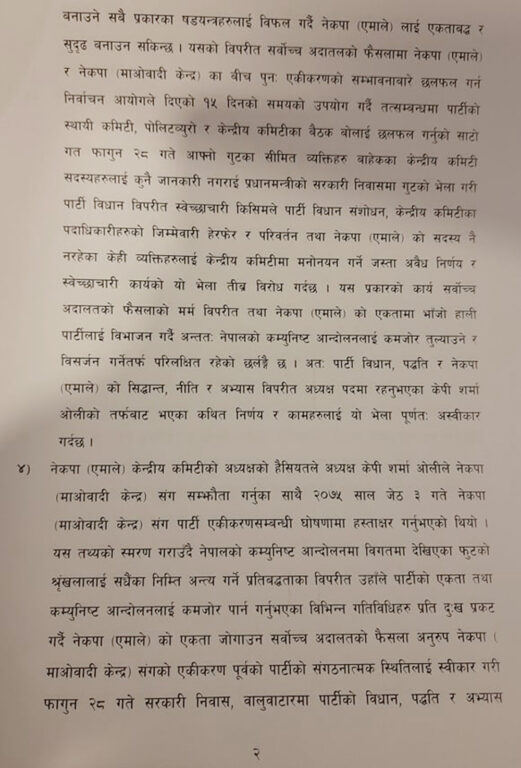 ५ चैत्र, काठमाडौं । नेकपा एमालेका वरिष्ठ नेता झलनाथ खनाल र माधव कुमार नेपाल समुहले पार्टी अध्यक्ष केपी शर्मा ओलीले गरेको निर्णय अस्वीकार गर्ने भन्दै देशभरका पार्टी कमिटी ब्युँताउने घोषणा गरेको छ । सर्वोच्च अदालतले पार्टी ब्युँताए पनि अध्यक्ष ओलीले एकलौटी ढंगले नयाँ कमिटीलाई निरन्तरता दिएकोप्रति असन्तुष्टि जनाउदै खनाल नेपाल समुहले २०७५ जेठ २ गते कायम रहेको पार्टी कमिटीलाई निरन्तरता दिने घोषणा गरेको हो ।