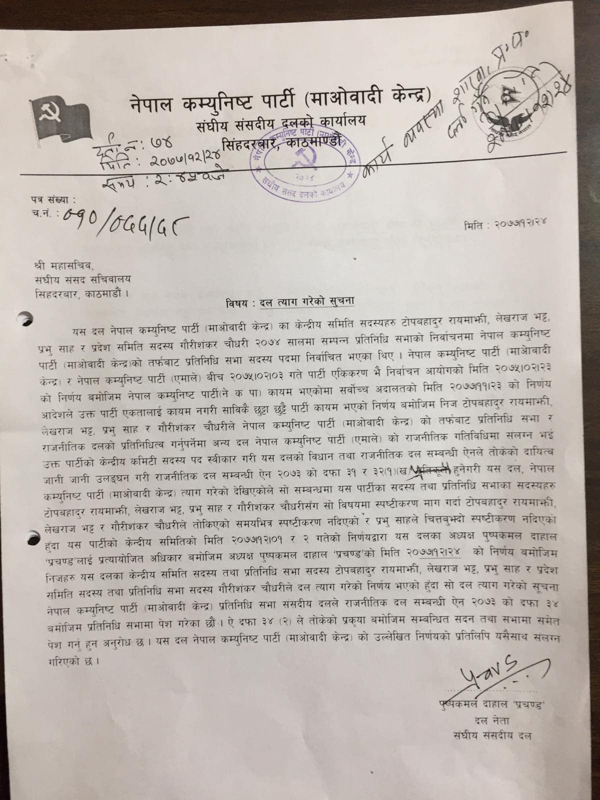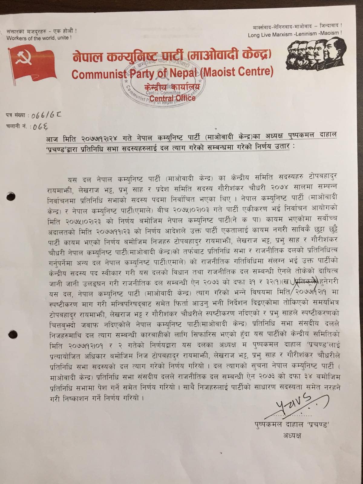 नेकपा माओवादी केन्द्रका तर्फबाट प्रतिनिधिसभामा विजयी ४ सांसदको पद निलम्बन भएको छ । सांसदहरु टोप बहादुर रायमाझी, लेखराज भट्ट, प्रभु शाह र गौरी शंकर चौधरीलाई पार्टी सदस्य र सांसद समेत नरहने गरी कारबाही गरिएको हो । कारवाही गरेको पत्र संसद सचिवालयमा दर्ता गराएको छ ।