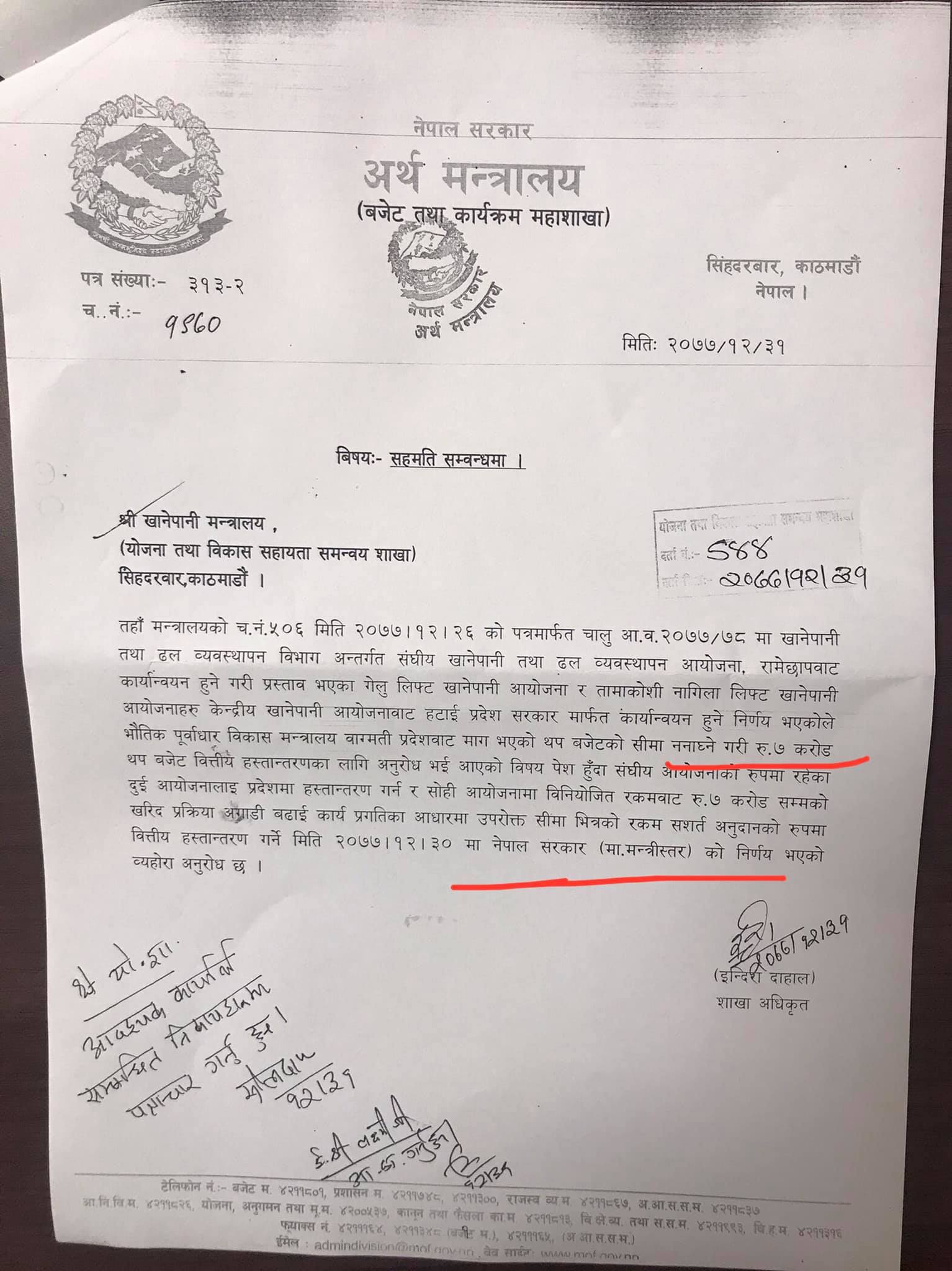 अर्थ मन्त्रालयको शाखा अधिकृत इन्दिरा दाहालद्धारा हस्ताक्षर गरिएको पत्रमा भनिएको छ–दुवै लिफ्ट खानेपानी आयोजनहरु केन्द्रीय खानेपानी आयोजनाबाट हटाई प्रदेश सरकार मार्फत कार्यान्वयन हुने निर्णय भएकोले भौतिक पूर्वाधार विकास मन्त्रालय बागमती प्रदेशबाट माग भएको थप बजेटको सीमा ननाघ्ने गरी ७ करोड थप बजेट वित्तीय हस्तान्तरणका लागि अनुरोध भइ आएको विषय पेश हुँदा संघीय आयोजनाको रुपमा रहेका दुई आयोजनालाई प्रदेशमा हस्तान्तरण गर्न र सोही आयोजनामा विनियोजित रकमबाट ७ करोड सम्म खरिद प्रक्रिया अगाडि बढाई कार्य प्रगतिका आधारमा उपुरोक्त सीमा भित्रको रकम सशर्त अनुदानको रुपमा वित्तीय हस्तान्तरण गर्ने मिति २०७७।१२।३० मा अथ मन्त्रालयको मन्त्रीस्तरीय निर्णय भएको व्यहोरा अनुरोध छ ।