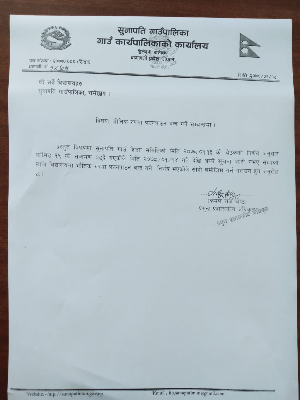 सुनापति गाउँपालिकाद्धारा भाेलीदेखि विद्यालय बन्द गर्ने निर्णय (विज्ञप्तीसहित)