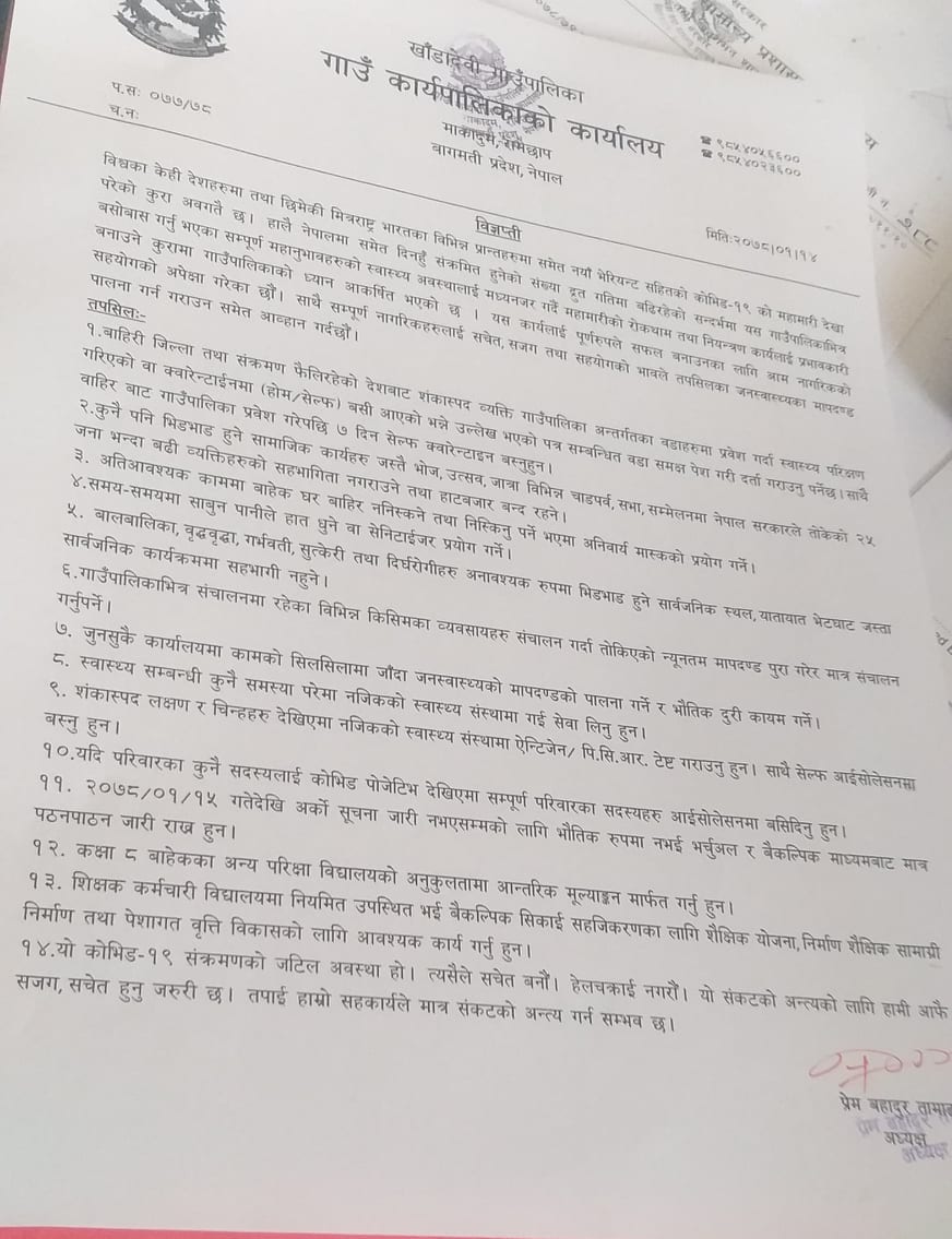 कोरोना रोकथाम र नियन्त्रण गर्न खाँडादेवी गाउँपालिकाको १४ बुँदे निर्णय (सूचनासहित)