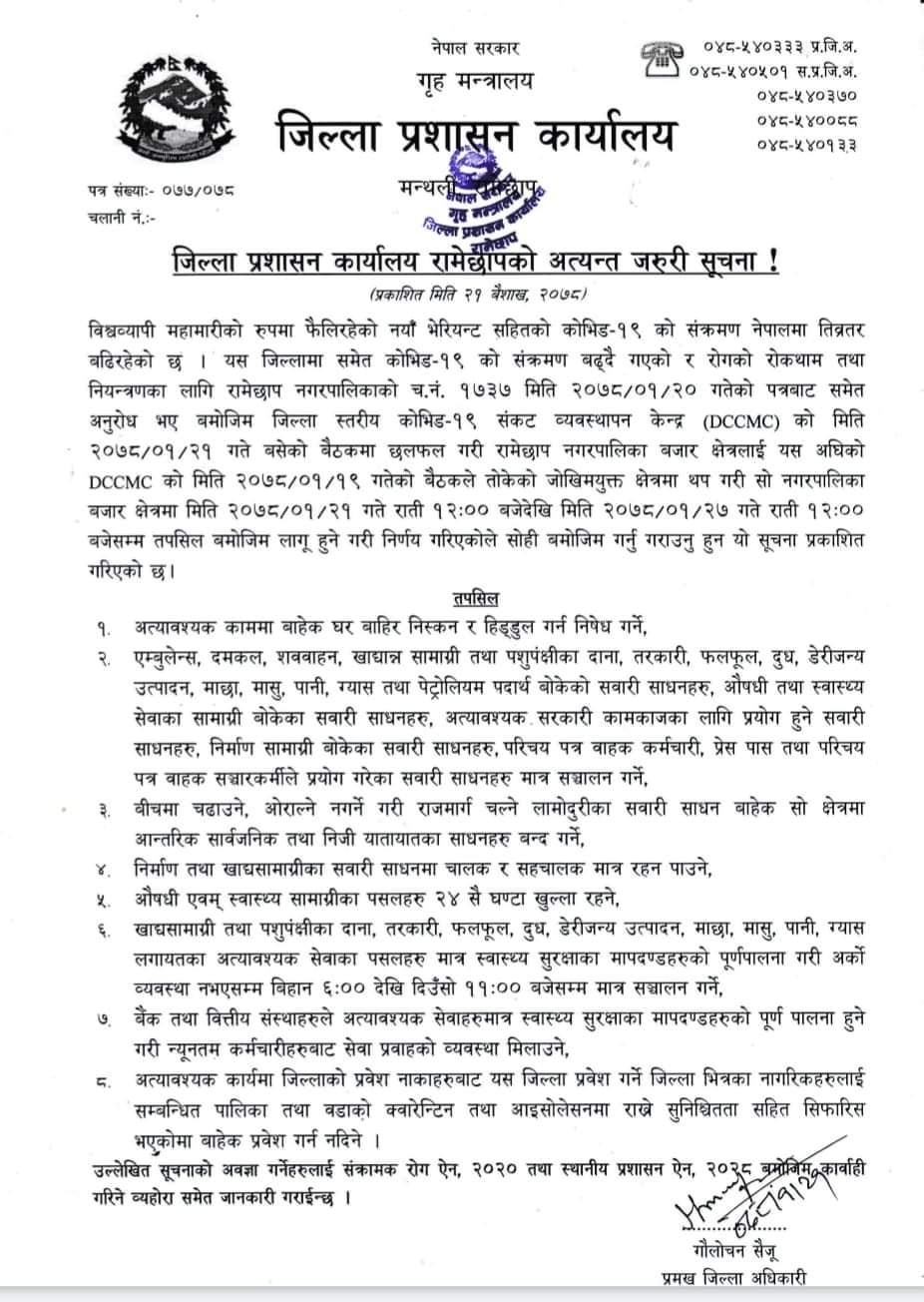 रामेछाप जिल्लामा जारी लकडाउन भोलीबाट थप कडा पारिने भएको छ । जिल्ला प्रशासन कार्यालय रामेछापले सदरमुकाम मन्थली, रामेछाप नगरपालिकाको रामेछापसहितको बजार क्षेत्रमा लकडाउन गरिसकेको छ ।
