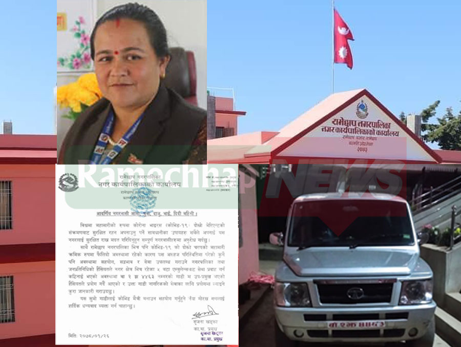 रामेछाप नगरपालिकामा कोरोना संक्रमितको संख्या बढदै गएपछि रामेछाप नगरपालिकाका उपप्रमुख सृजना खडकाले आफूले चढदै आएको गाडी कोरोना संक्रमित बिरामी बोक्नको लागि दिने निर्णय गरेकी छिन् । संक्रमितलाई अस्पतालसम्म लैजान एम्बुलेन्सको अभाव नहोस भनेर उनले चढदै आएको गाडीलाई एम्बुलन्सको रुपमा तयारी गरिएको हो ।