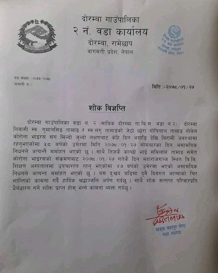 दोरम्बा गाउँपालिका–२ दोरम्बाका वडा अध्यक्ष खड्क बहादुर श्रेष्ठले वडाका दुई जनाको कोरोना संक्रमणसँग मिल्दोजुल्दो लक्षणबाट मृत्यु भएको जानकारी दिए ।