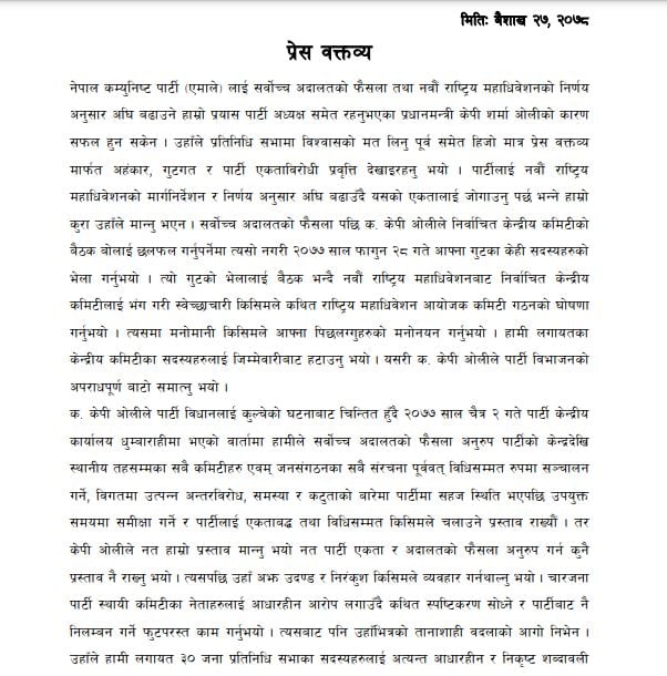 ओलीले अपराधपूर्ण बाटो समात्नु भयोः नेता नेपाल (विज्ञप्तीसहित)