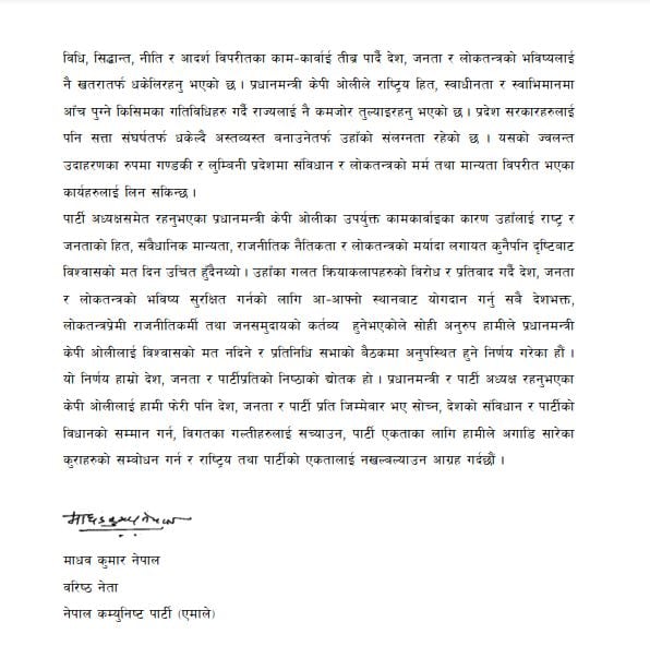 नेकपा एमालेका वरिष्ठ नेता माधव कुमार नेपालले प्रधानमन्त्री केपी शर्मा ओलीले अपराधपूर्ण बाटो समातेको आरोप लगाएका छन् । उनले प्रधानमन्त्रीलाई विश्वासको मत दिन सदनमा अनुपस्थित हुनु निष्ठाको द्योतक भएको चित्रण गरेको बताएका ुहन् । नेता नेपालसहित २८ सांसदहरूले सोमवार पार्टीको ह्वीप उल्लंघन गर्दै प्रधानमन्त्री केपी शर्मा ओलीलाई विश्वासको मत दिन अस्वीकार गरेका थिए । संसदमा प्रधानमन्त्री ओलीलाई मत नदिएको कारणको बारेमा सोमवार एक विज्ञप्ती जारी गर्दै नेपालले आफने समुहको धारणा सार्वजनिक गरेका छन् ।