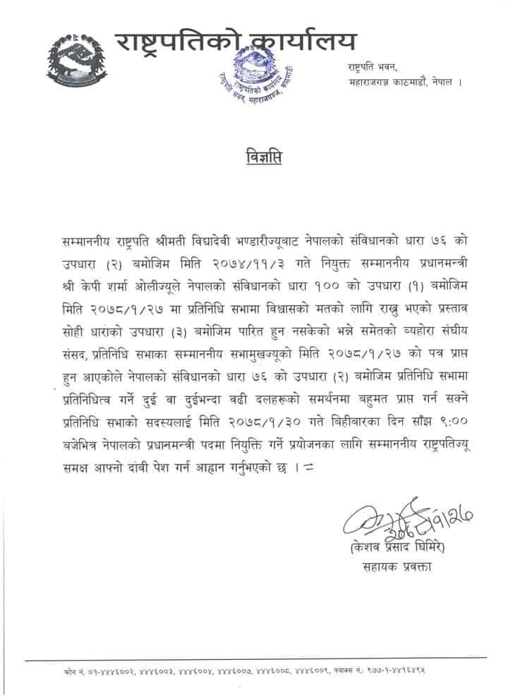 प्रधानमन्त्री केपी शर्मा ओलीले नेपालको संविधानको धारा १०० को उपधार (१) बमोजिम प्रतिनिधिसभामा विश्वासको मतको लागि राखेको प्रस्ताव सोही धाराको उपधारा ९३० बमोजिम पारित हुन नसकेको भन्ने समेतको व्यहोरा संघीय संसद, प्रतिनिधिसभाका सभामुखको पत्र प्राप्त हुन आएकोले नेपालको संधिवानको धारा ७६ को उपधारा (२) बमोजिम प्रतिनिधि सभामा प्रतिनिधित्व गर्ने दुई वा दुईभन्दा बढी दलहरुको समर्थनमा बहुमत प्राप्त गर्न सक्ने प्रतिनिधिसभाको सदस्यलाई वैशाख ३० गते बिहीबारका दिन साँझ ९ बजेभित्र नेपालको प्रधानमन्त्री पदमा नियुक्त गर्ने प्रयोजनका लागि राष्ट्रपतिसमक्ष आफ्नो दाबी पेश गर्न आह्वान गरिएको राष्ट्रपति कार्यालयले जनाएको छ ।