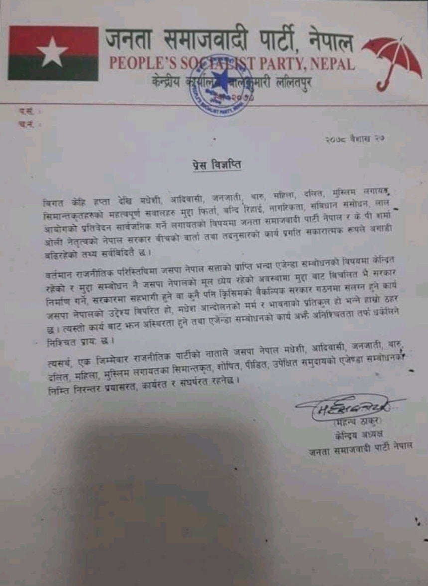 ‘ मधेसी,थारु,दलित,मुस्लिम ,सिमान्तकृत लगायतका मुद्धा फिर्ता बन्दी रिहाइ,नागरिकता,संविधान संसोधन लाल आयोगको प्रतिवेदन सार्वजनिक गर्ने लगायतका बिषयमा ’ ठाकुरको विज्ञप्तीमा भनिएको छ ‘जसपा नेपाल र केपी शर्मा ओली नेतृत्वको नेपाल सरकार बीच वार्ता तथा तदअनुसारको कार्य प्रगति सकारात्मक रुपले अगाडी बढी रहेको तथ्य सर्वविधितै छ । त्यस कारण वर्तमान अवस्थामा जसपा सत्ता प्राप्ती भन्दा राजनीतिक एजेण्डा स्थापना गर्ने कार्यमा लाग्दछ ।’