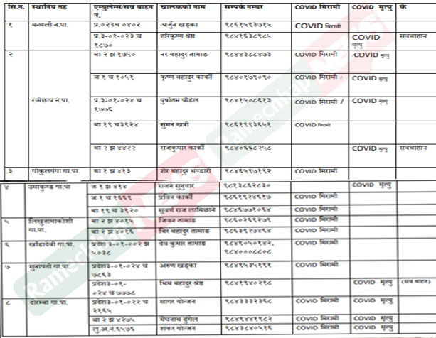 यी हुन रामेछापमा कोरोना संक्रमित बिरामी बोक्ने एम्बुलेन्स (नाम र नम्बरसहित)