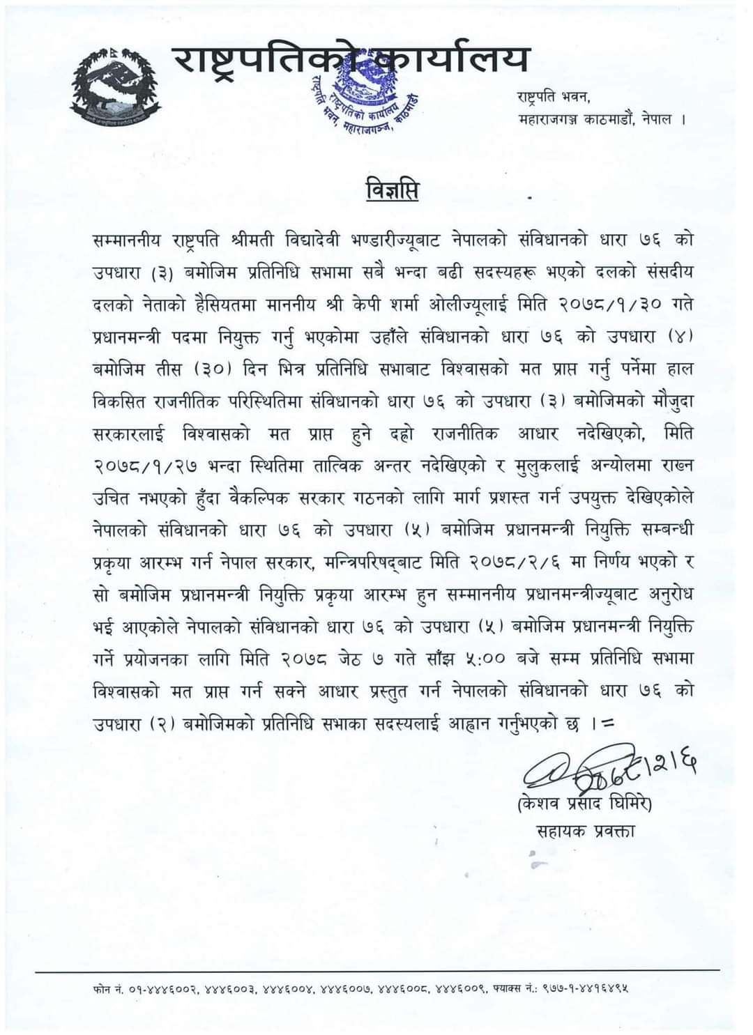 राष्ट्रपति भण्डारीले बिहीबार बसेको मन्त्रिपरिषद बैठकको निर्णय र प्रधानमन्त्रीको अनुरोधका आधारमा धारा ७६ (५) को सरकार गठनका लागि आह्वान गरेको राष्ट्रपति कार्यालयको पत्रमा उल्लेख छ ।उक्त पत्र अनुसार बिहीबारको मन्त्रिपरिषद बैठकले हाल विकसित राजनीतिक परिस्थितिमा सरकारलाई विश्वासको मत प्राप्त हुने आधार नदेखिएको र मुलुकलाई अन्योलमा राख्न उचित नभएको भन्दै वैकल्पिक सरकार गठनका लागि मार्गप्रशस्त गर्न उपयुक्त देखिएको निर्णय थियो । राष्ट्रपति भण्डारीले धारा ७६ (५) अनुसारको प्रधानमन्त्री नियुक्ति प्रयोजनका लागि जेठ ७ गते साँझ ५ बजेसम्मको समय दिएकी छन् ।
