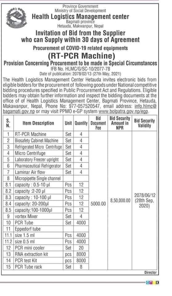 रामेछाप जिल्लामा पिसिआर मेसिन स्थापना गर्न प्रदेश सरकारले निकाल्यो सूचना