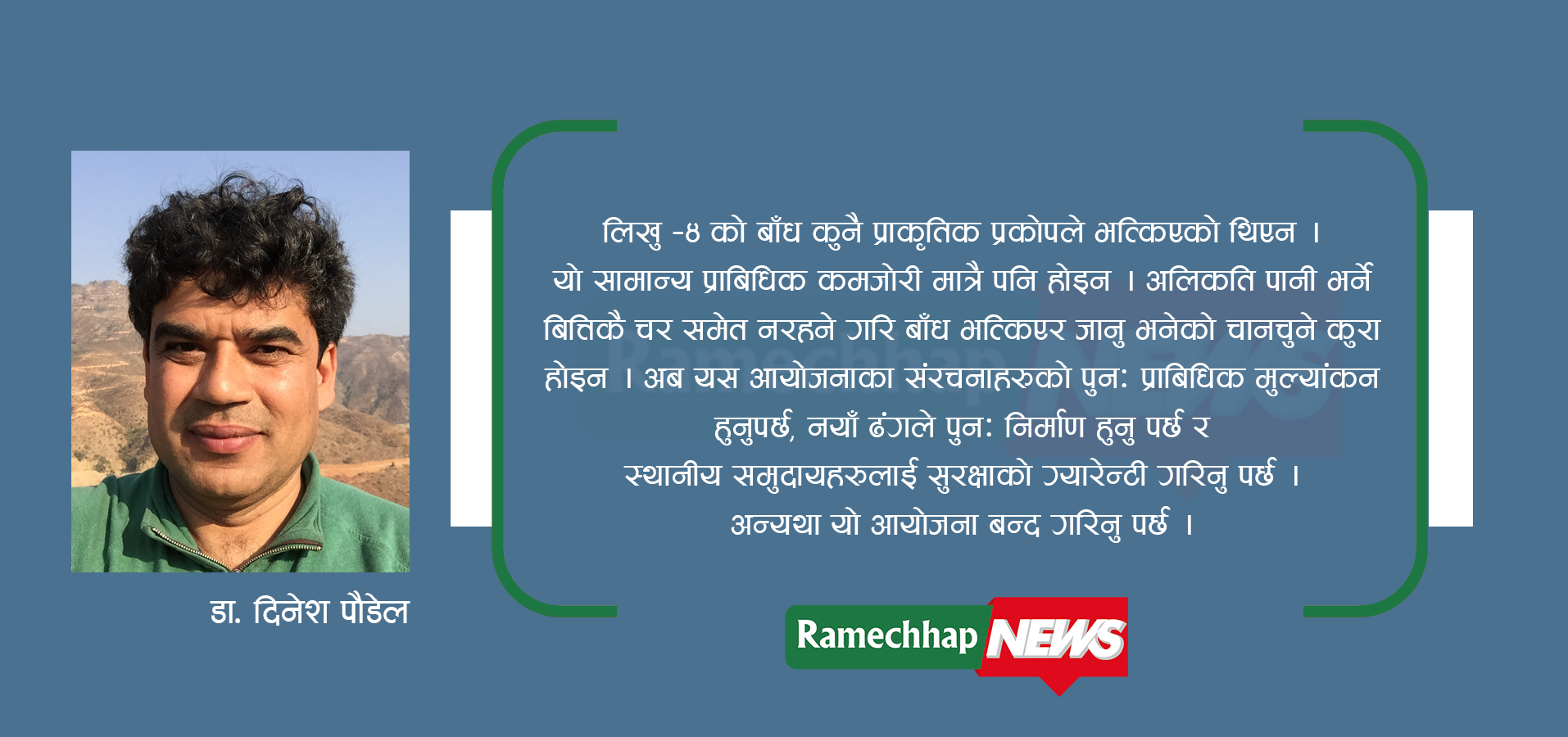 लिखु – ४ को बाँध कुनै प्राकृतिक प्रकोपले भत्किएको थिएन । यो सामान्य प्राबिधिक कमजोरी मात्रै पनि होइन । अलिकति पानी भर्ने बित्तिकै चर समेत नरहने गरि बाँध भत्किएर जानु भनेको चानचुने कुरा होइन । यो अबस्थामा लिखु –४ र यस्तै खाले अन्य आयोजनाहरुलाई निरन्तरता दिनु कतिको उपयुक्त हो ?