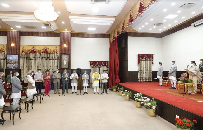पुनर्गठित मन्त्रिपरिषदमा विष्णु पौडेल उपप्रधानसहित अर्थ, रघुवीर महासेठ उपप्रधानसहित परराष्ट्र र राजेन्द्र महतो उपप्रधानसहित शहरी विकास मन्त्री बनेका छन्। उनीहरूले आजै राष्ट्रपति विद्यादेवी भण्डारीबाट पद तथा गोपनियताको सपथ लिएका हुन्। शेरबहादुर तामाङलाई स्वास्थ्य मन्त्रालयको जिम्मेवारी दिइएको छ। जसपाबाट शरतसिंह भण्डारी ऊर्जा, जलस्रोत तथा सिँचाई, अनिल झा खानेपानी तथा सरसफाई, लक्ष्मणलाल कर्ण भूमि व्यवस्था, सहकारी तथा गरिबी निवारण मन्त्री बनेका छन्।