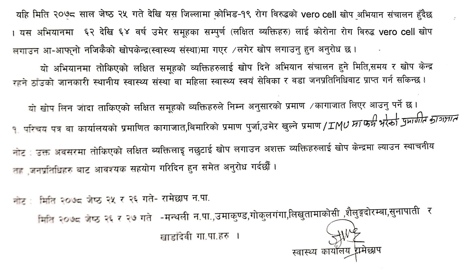 जेठ २५ र २६ गते रामेछाप नगरपालिकामा, जेठ २६ र २७ गते मन्थली नगरपालिका सहित उमाकुण्ड,गोकुलगंगा, लिखु तामाकोशी, दोरम्बा, सुनापति र खाँडादेवी गाउँपालिकामा कोरोना विरुद्धको भेरोसेल खोप लगाइने स्वास्थ्य कार्यालय  रामेछापका प्रमुख जितेन्द्र कर्णका अनुसार ६२ देखि ६४ वर्ष उमेर समुहका लक्षित समहका व्यक्तिलाई आफ्नो नजिकैको खोप केन्द्र(स्वास्थ्य संस्था) गएर खोप लगाउन सक्नेछन् ।