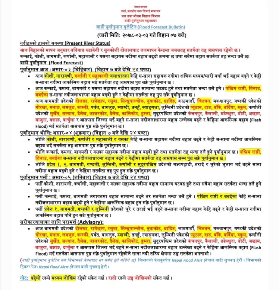 जिल्ला प्रशासन कार्यालय रामेछापले अविरल बर्षासँगै सुनकोसी र तामाकोसी नदीमा पानीको बाहब बढने पूर्व अनुमान अनुसार जिल्ला स्थित नदी किनाराका बासिन्दालाई उच्च सतर्कता अपनाउन आग्रह गरेको छ ।