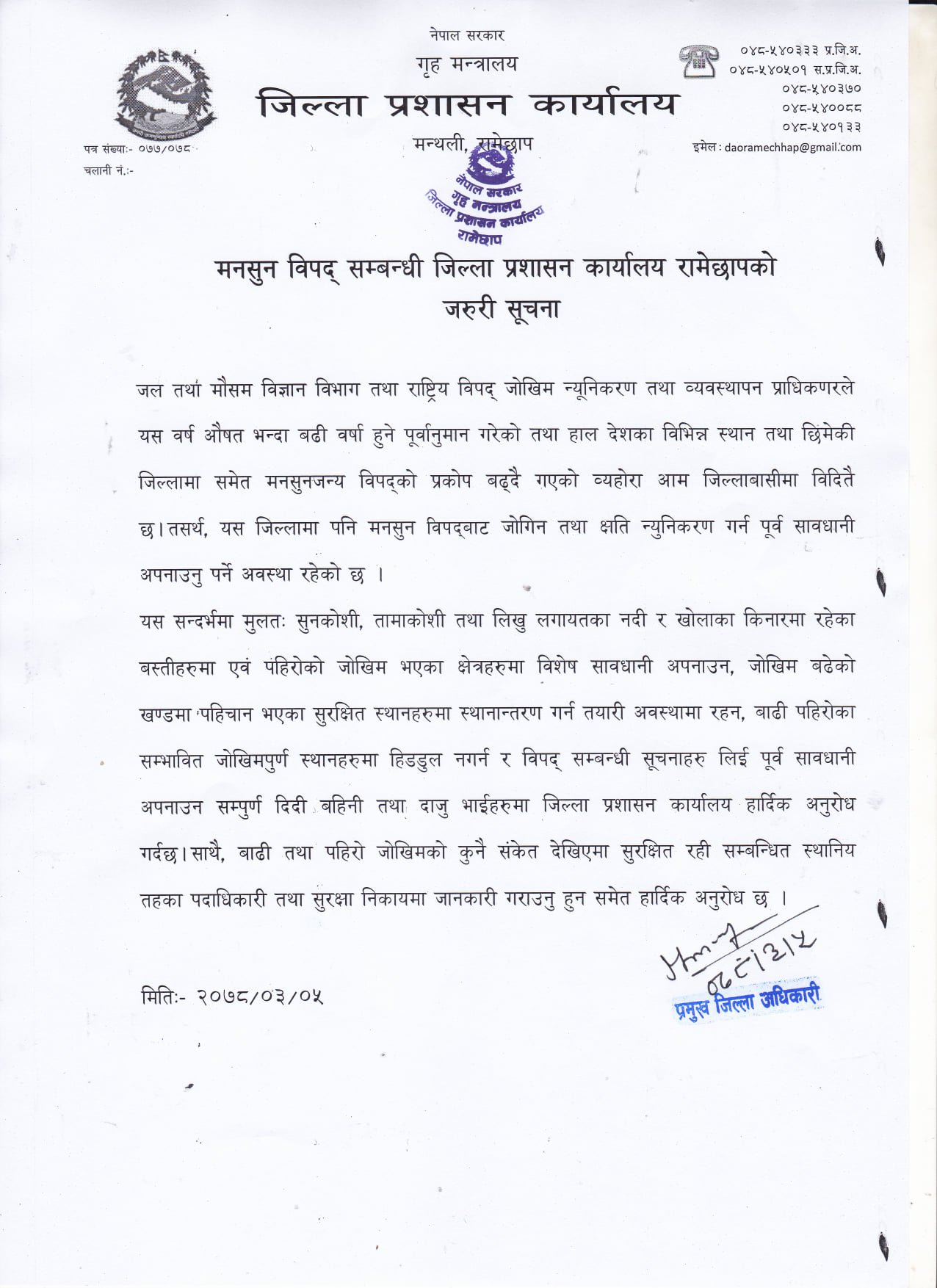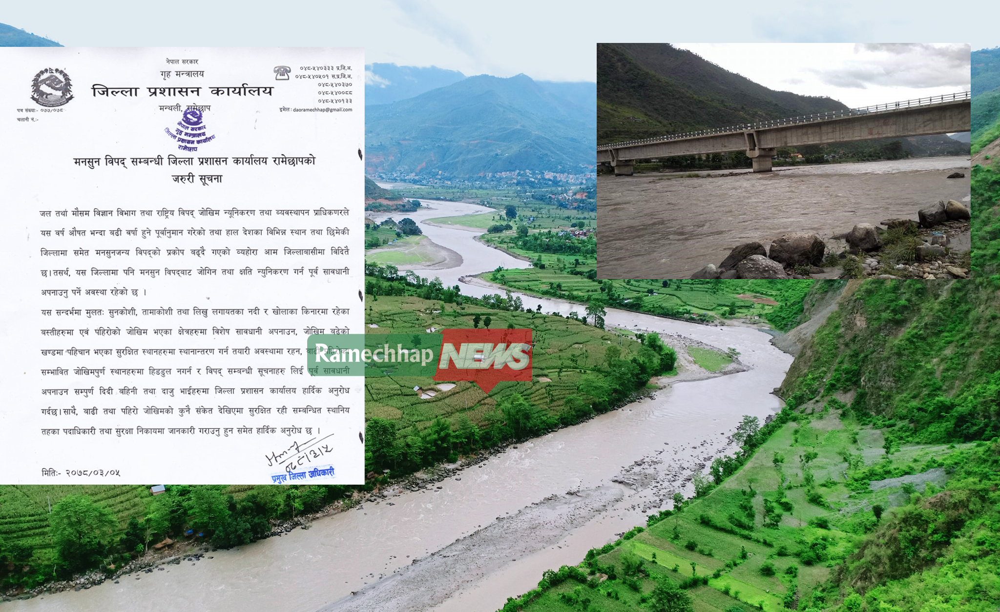 रामेछापका प्रमुख जिल्ला अधिकारी गौलोचन सैजूले आज एक विज्ञप्ती जारी गर्दै नदी किनाराका बस्ती जोखिममा पर्न सक्ने भएकाले आसपासका बासिन्दालाई सतर्क हुन आग्रह गरेका छन् । विज्ञप्तीमा सुनकोसी तामाकोसी तथा लिखु नदी लगायतका खोलाका किनारामा पानीको बहाब बढने भएकाले सतर्क रहन भनिएको छ । जोखिमपूर्ण नदी तथा खोला किनारामा हिडडुल नगर्न पनि जिप्रका रामेछापले नागरिकहरुमा अपिल गरेको छ ।