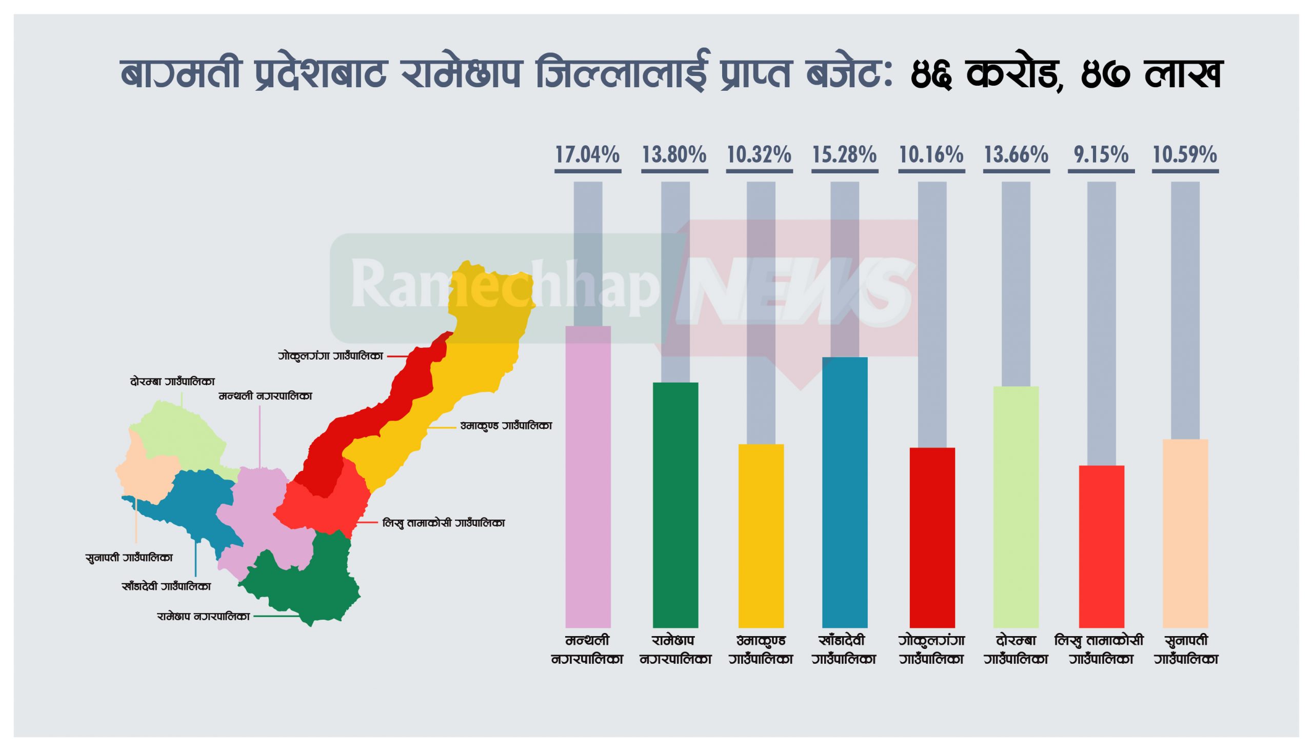 प्रदेश सरकारले मन्थली नगरपालिकाकाे लागि ७ करोड ९२ लाख १६ हजार, रामेछाप नगरपालिकाकाे लागि ६ करोड ४१ लाख २८ हजार उपलब्ध गराएको छ । त्यसैगरी प्रदेश सरकारले उमाकुण्ड गाउँपालिलाई ४ करोड ७९ लाख ८६ हजार, खाँडादेवी गाउँपालिलाई ७ करोड, १० लाख १९ हजार, गोकुलगंगा गाउँपालिकालाई ४ करोड ७२ हजार, दोरम्बा गाउँपालिकालाई ६ करोड ३५ लाख, लिखु तामाकोसी गाउँपालिकालाई ४ करोड २५ लाख १० हजार र सुनापति गाउँपालिकाः ४ करोड ९२ लाख, ३९ हजार बजेट उपलब्ध गराएको छ ।