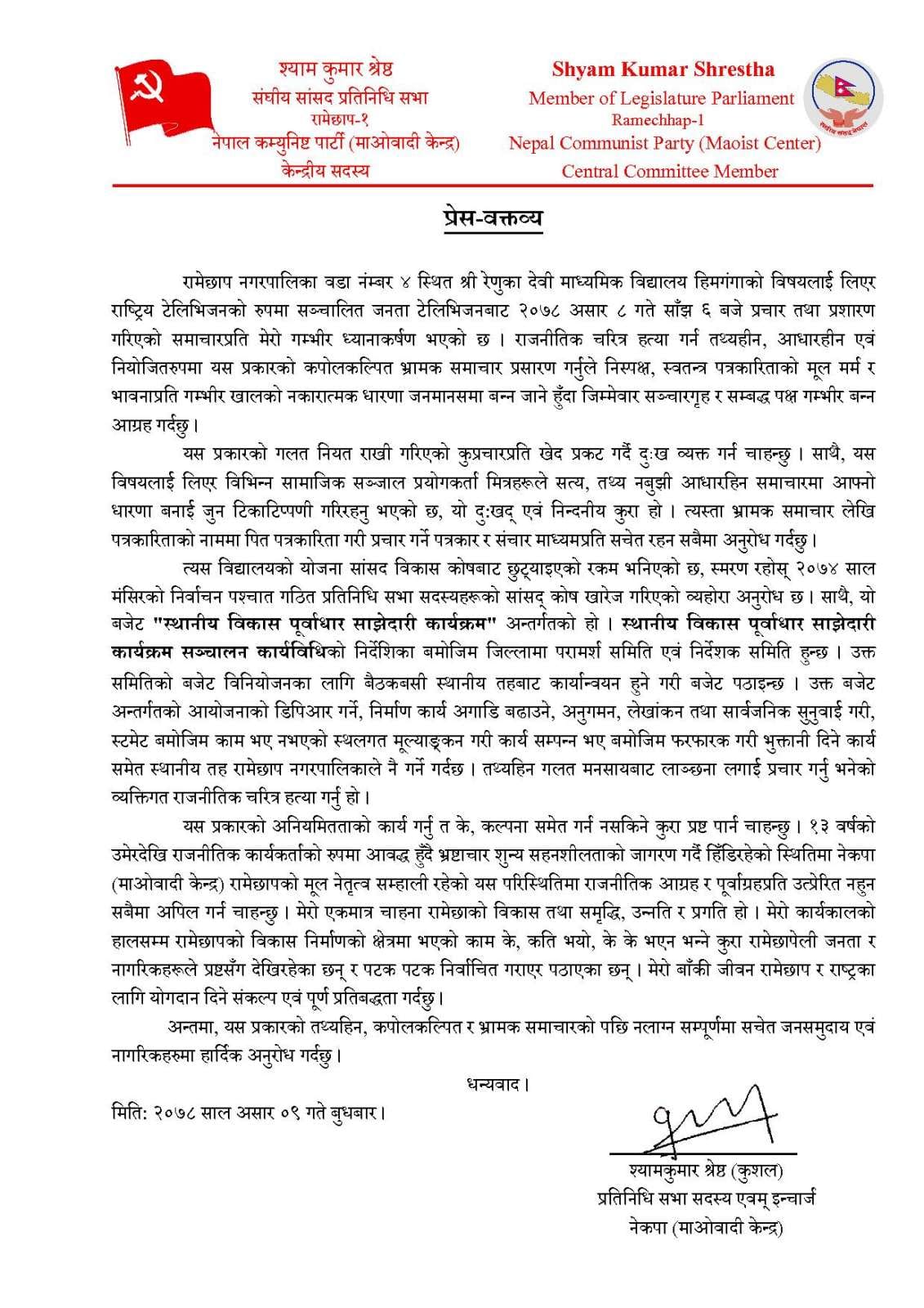 बुधवार एक विज्ञप्ती जारी गर्दै नेता श्रेष्ठले आफ्नो राजनीतिक चरित्र हत्या गर्ने उदेश्यले उक्त समाचार सम्प्रेषण भएको भन्दै सञ्चारगृह र सम्बद्ध पक्षलाई गम्भीर हुन पनि आग्रह गरेका छन् ।