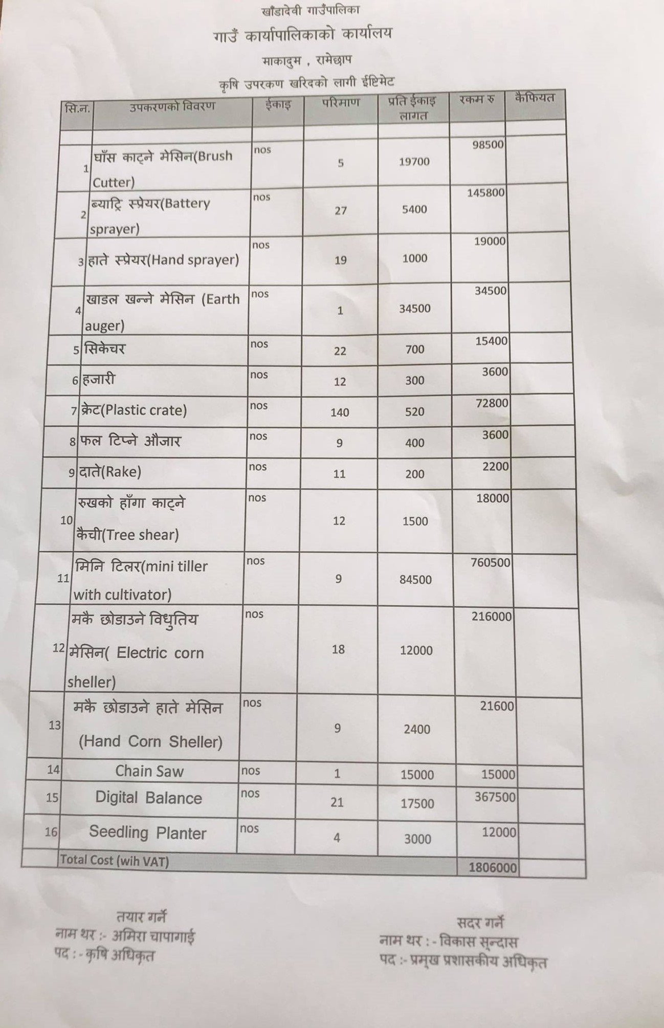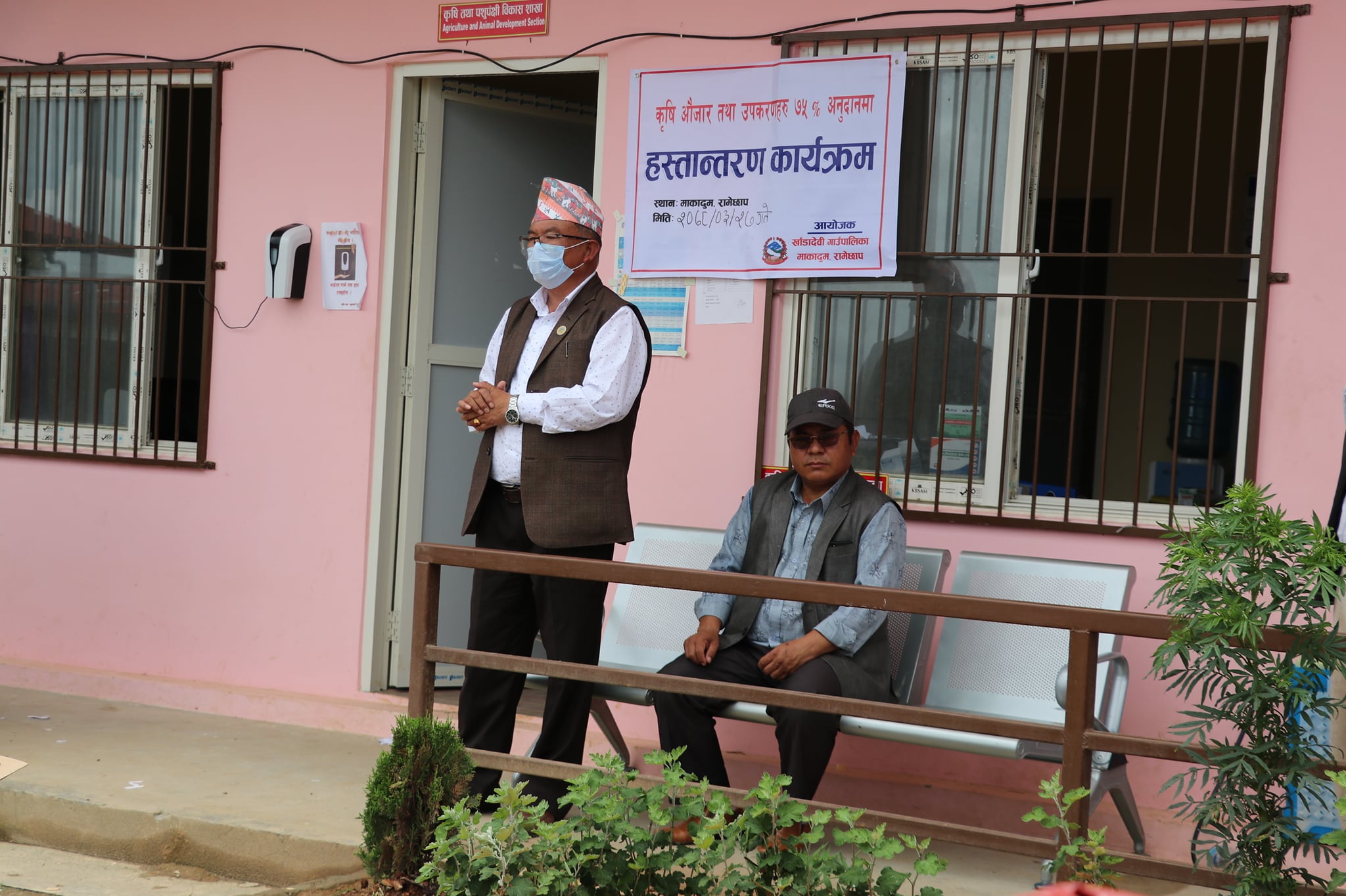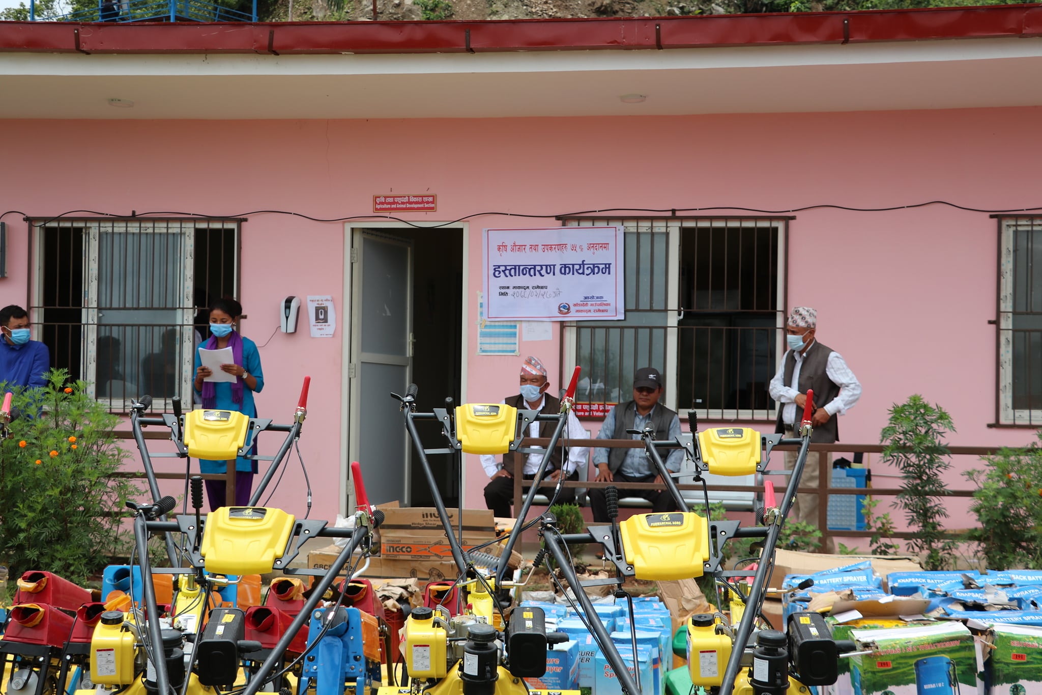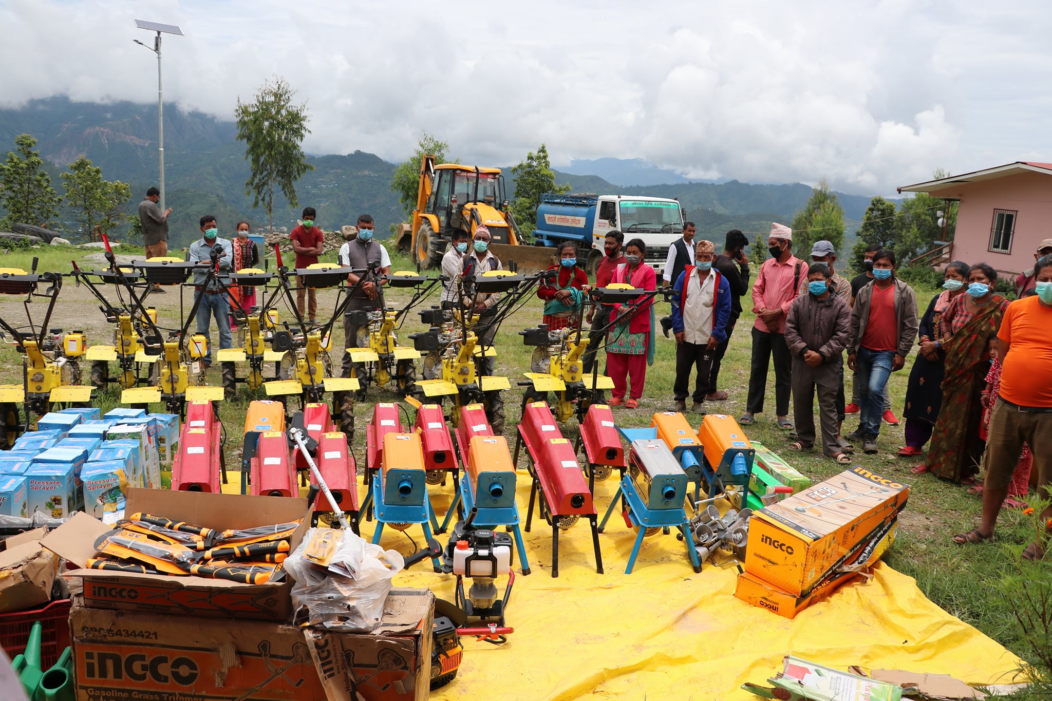 गाउँपालिकाले ९ वटा मनिटिलर, १८ वटा मकै छोडाउने विद्युतीय मेसिन, घाँस काट्ने मेसिन ५ वटा, ब्याट्री स्प्रे ठूलो २७ र हाते ९ वटा, खाडाल खन्ने मेसिन एक वटा, सिकेन्चर २२ वटा, हजारी १२ वटा, सामाग्री हाल्ने क्रेट १ सय ४० वटा,फलफूल टिप्ने मेसिन ९ वटा, दाँते ११ वटा, रुंखको हाँग काट्ने सानो कैचीं १२ र ठूलो एक वटा, मकै छोडाउने हाते मेसिन ९ वटा डिजिटल ब्यलेन्स तराजु २१ वटा र सेलिङ प्लान्ट रुख रोप्ने मिसिन लगायतको सामाग्री हस्तान्रण गरेको छ ।