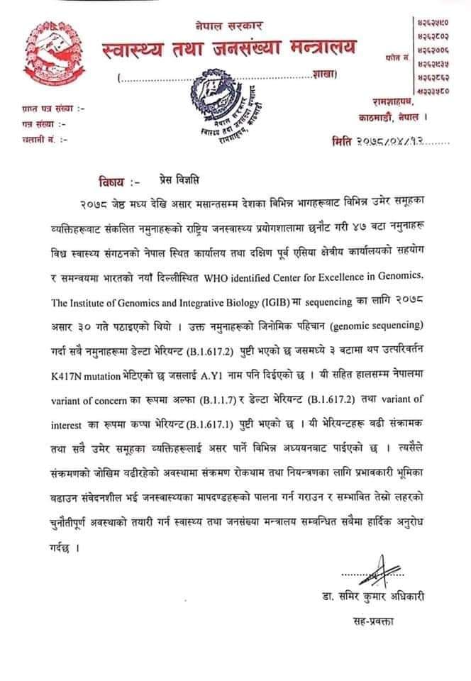 राष्ट्रिय जनस्वास्थ्य प्रयोगशालाले सङ्कलन गरेको ४७ जनाको नमूनाको विश्व स्वास्थ्य सङ्गठनले प्रमाणित गरेको नयाँ दिल्लीस्थित प्रयोगशालामा परीक्षण गर्दा तिनमा डेल्टा भेरिएन्ट पुष्टि भएको तथा अल्फा भेरिएन्ट, डेल्टा भेरिएन्ट र कप्पा भेरिएन्टका उत्परिवर्तन फेला परेको जानकारी दिँदै मन्त्रालयले सर्वसाधारणलाई जनस्वास्थ्यका मापदण्ड पालना गर्न र सम्भावित तेस्रो लहरको तयारीमा जुट्न स्वास्थ्य सेवा प्रदायक निकाय र स्वास्थ्यकर्मीहरूमा अनुरोध गरेको छ ।