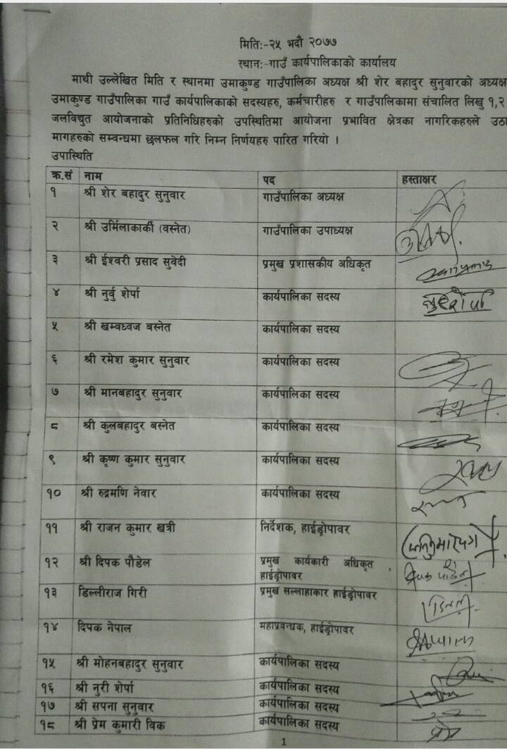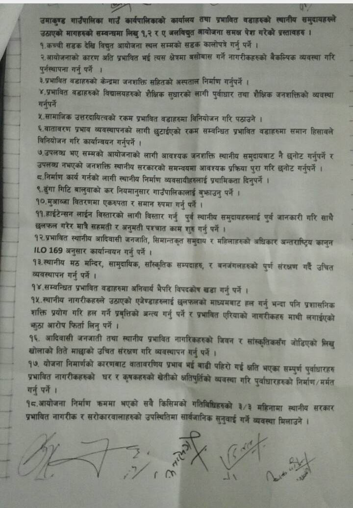 उमाकुण्ड गाउँपालिका र दुगड गु्रपबीच भएको १९ बुँदे सहमति कार्यान्वयन नभएको भन्दै गाउँपालिकावासी आक्रोशित भएका छन् । आयोजनाबाट प्रभावित क्षेत्रको सडकमा आवतजावत गर्न समेत कठिन हुने अवस्था सृजना भएसँगै स्थानीयले सहमति कार्यान्वयन नभए आन्दोलनमा उत्रने चेतावनी दिएका हुन् । स्थानीयवासीले विभिन्न माग राखेर आन्दोलन सुरु गरेपछि गत भदौमा गाउँपालिका र दुगड ग्रपका प्रतिनिधिबीच समस्या समाधान गर्नको लागि १९ बुँदे लिखित सहमति भएको छ । तर एक बर्ष वितिसक्दा समेत सहमति कार्यान्वयन गर्न दुगडले चासो नदेखाएको भन्दै प्रभावित क्षेत्रका बासिन्दाले गाउँपालिका र दुगड ग्रुपलाई सहमति तत्काल कार्यान्वयन गर्न दबाब दिएका छन् ।