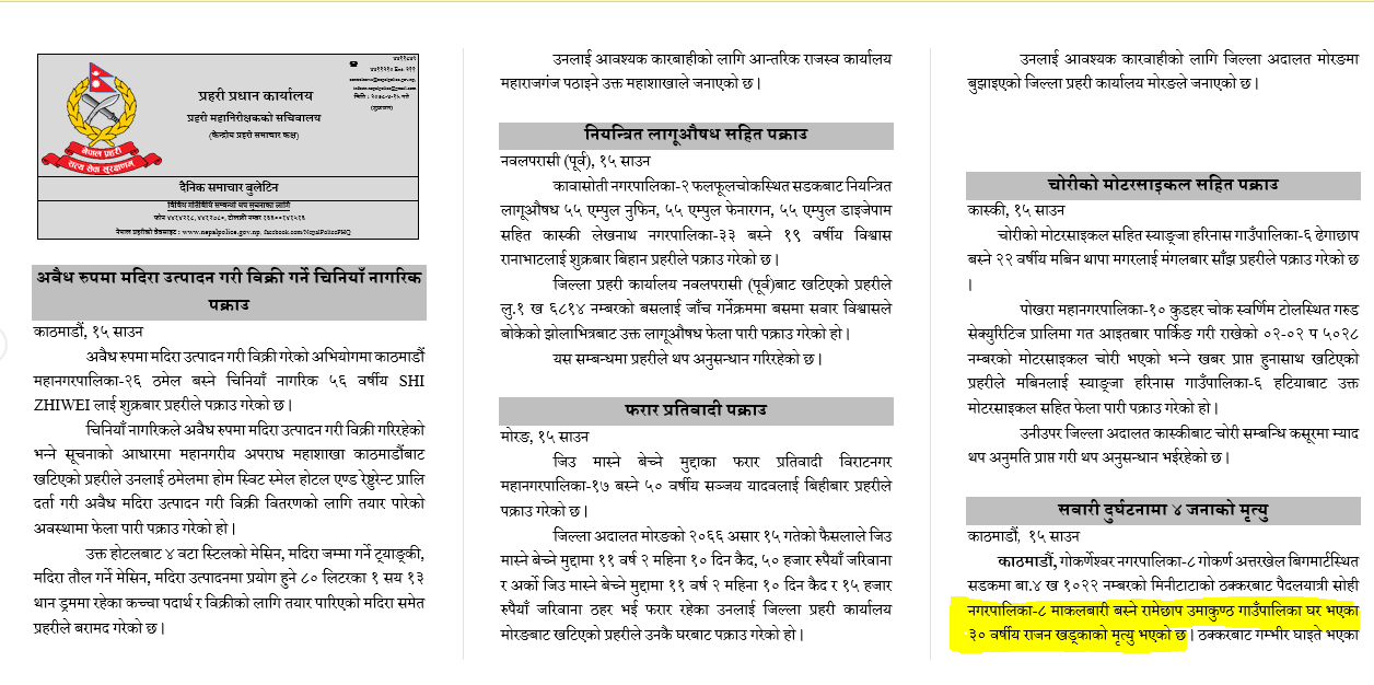 (अन्यथा भएकोमा सच्याइएको छः यसअघि तेज बहादुर नेपाली हुनुपर्नेमा अन्यथा भएकोमा सच्याएको छ । यसअघि नेपाली प्रहरीको केन्द्रीय कार्यालयमा जारी दैनिक समाचार बुलेटिनमा राजन खड्का उल्लेख गरिएको थियो । नेपाल प्रहरीका प्रवक्ता बसन्त बहादुर कुँबरले नाम अन्यथा भएकोमा सच्याइने जानकारी दिए ।)