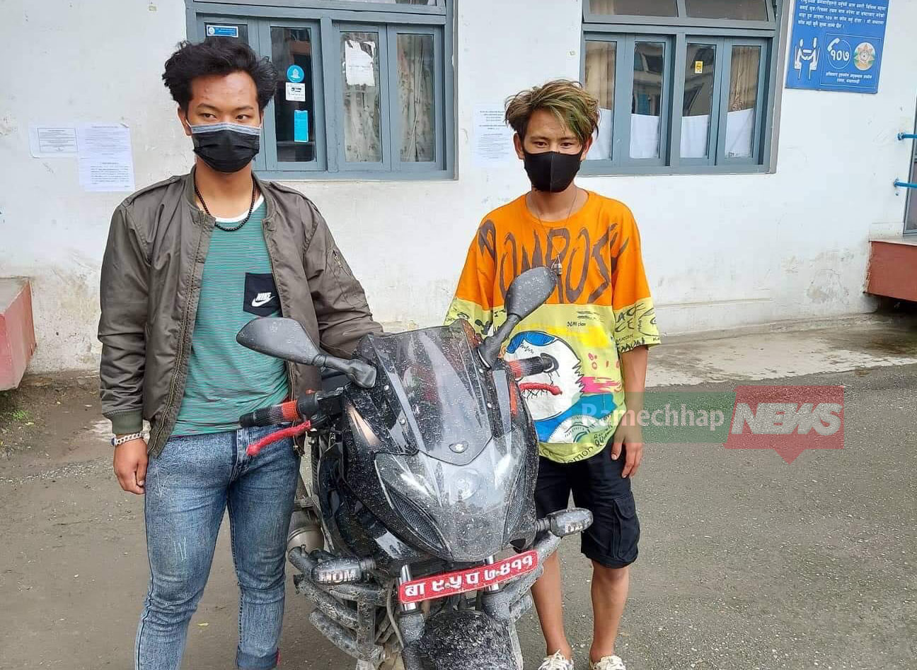 हराएको बा ९४ प ७१६४ नम्बरको पल्सर मोटरसाईकल चोरी गरेको अभियोगमा रामेछाप खाडादेवी गाउँपालिका– ७ घर भई हाल काठमाण्डौ नारायणटार बस्ने वर्ष १८ को सुन्दर मगर र रामेछाप सुनापती गाउँपालिका– २ घर भई नारायणटार नै बस्ने दिपक सिंजाली मगर रहेका छन् ।