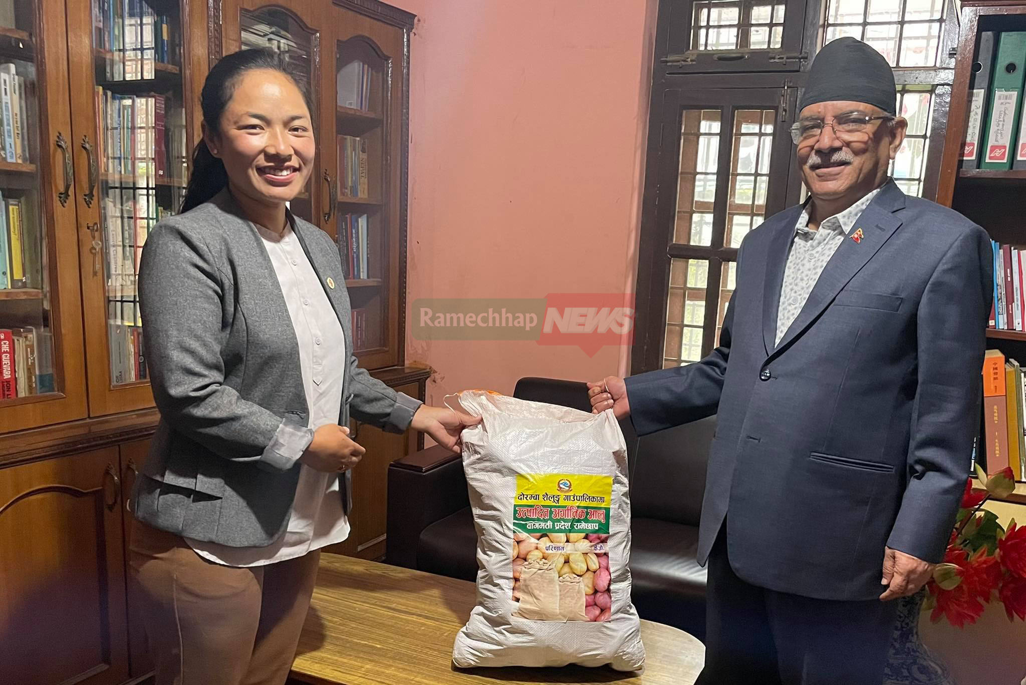 दोरम्बा शैलुङ्ग गाउँपालिकाले गाउँपालिकाभित्र उत्पादित हुने आलुको ब्राण्डिङको लागि नेकपा माओवादी केन्द्रका अध्यक्ष पुष्पकमल दाहाल ‘प्रचण्ड’लाई कोसेलीको रुपमा आलु उपलब्ध गराएको छ । गाउँपालिकाका उपाध्यक्ष कृशला घिसिङले आज प्रचण्ड निवास खुमलटारमा पुगेर कोसेली आलु उपलब्ध गराएकी हुन् ।