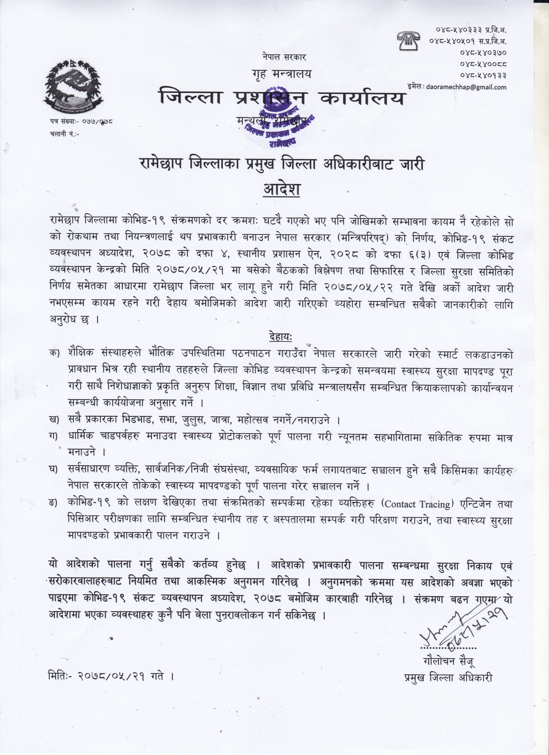 रामेछापका प्रमुख जिल्ला अधिकारी गौलोचन सैजूले अब भौतिक रुपमा नै विद्यालयमा पठनपाठन गर्न सकिने निर्णय गरिएको बताए । उनले रामेछाप न्युजसँग भने,‘कोभिडको कारण लामो समय विद्यालयमा भौतिक रुपमा पढाइ हुन सकेको छैन, हामीले स्वास्थ्य मापदण्ड पालना गरेर विद्यालय सञ्चालन गर्न सकिने निर्णय गरेका छौं ।’
