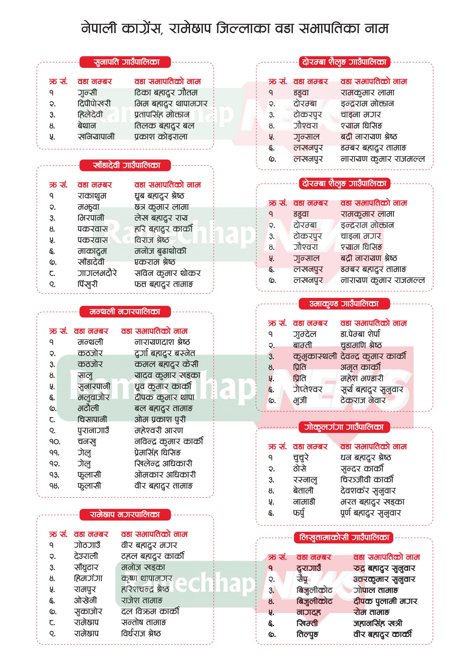 यी हुन कांग्रेस रामेछापका ६४ वडाका सभापति, कुन वडामा को ? (नामावलीसहित)