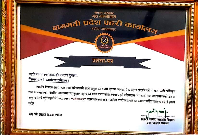 जिल्ला प्रहरी कार्यालय रामेछापका डिएसपी नवराज ढुंगाना उत्कृष्ट पुरस्कारबाट सम्मानित भएका छन् । ६६ औं प्रहरी दिवसको अवसरमा बागमती प्रदेश प्रहरी कार्यालयमा आयोजित एक कार्यक्रमकोबीच ढुंगाना सम्माति भएका हुन् ।