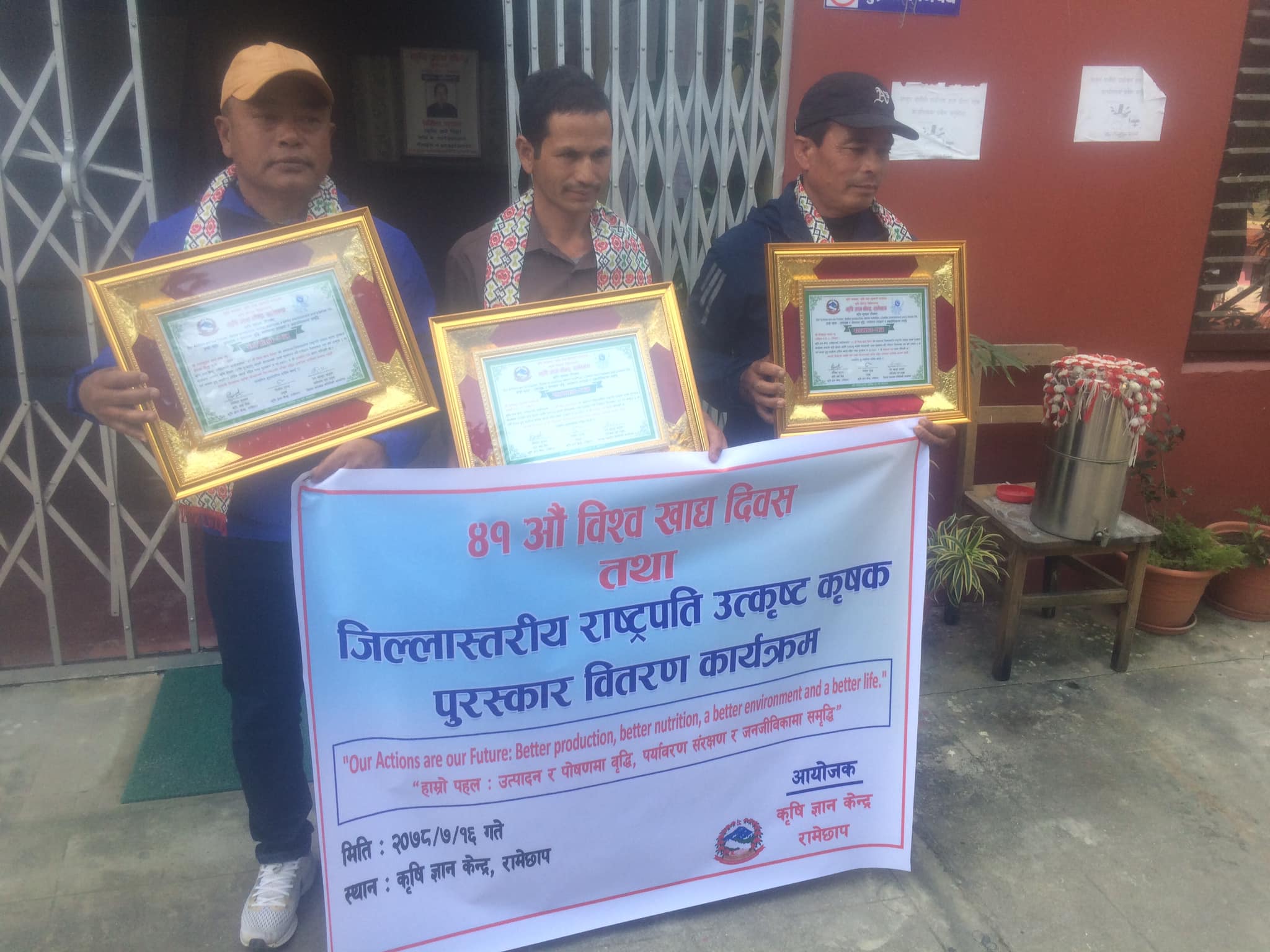 रामेछाप जिल्लामा कृषि व्यवसायमा लागेर उाहरणीय काम गरे बापत तीन जना कृषक राष्ट्रपति उत्कृष्ट पुरस्कारबाट पुरस्कृत भएका छन् । जिल्लामा रहेर कृषि पेशा माार्फत अन्य कृषकहरुलाई उत्प्रेरणा बनाउने काम गरेको भन्दै तीन जना कृषकलाई नगद दस हजार रुपैयाँ सहित पुरस्कृत गरेको हो ।